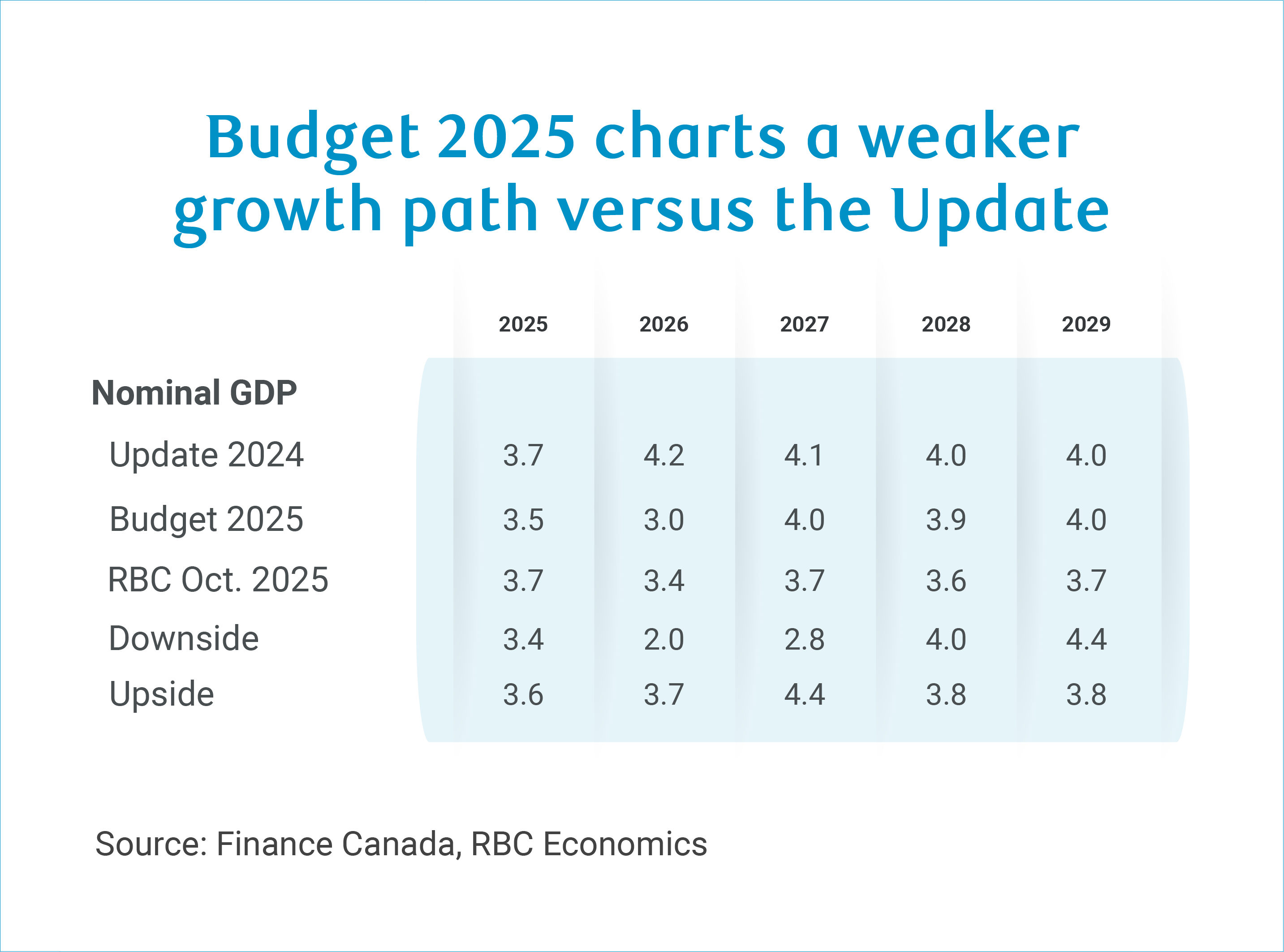 Budget 2025 charts a moderately weaker path for nominal GDP versus FES 2024, especially in 2026. The Budget’s growth assumption is also slightly weaker in 2025 and 2026 than RBC’s most recent forecast, but slightly stronger in the outer years.
