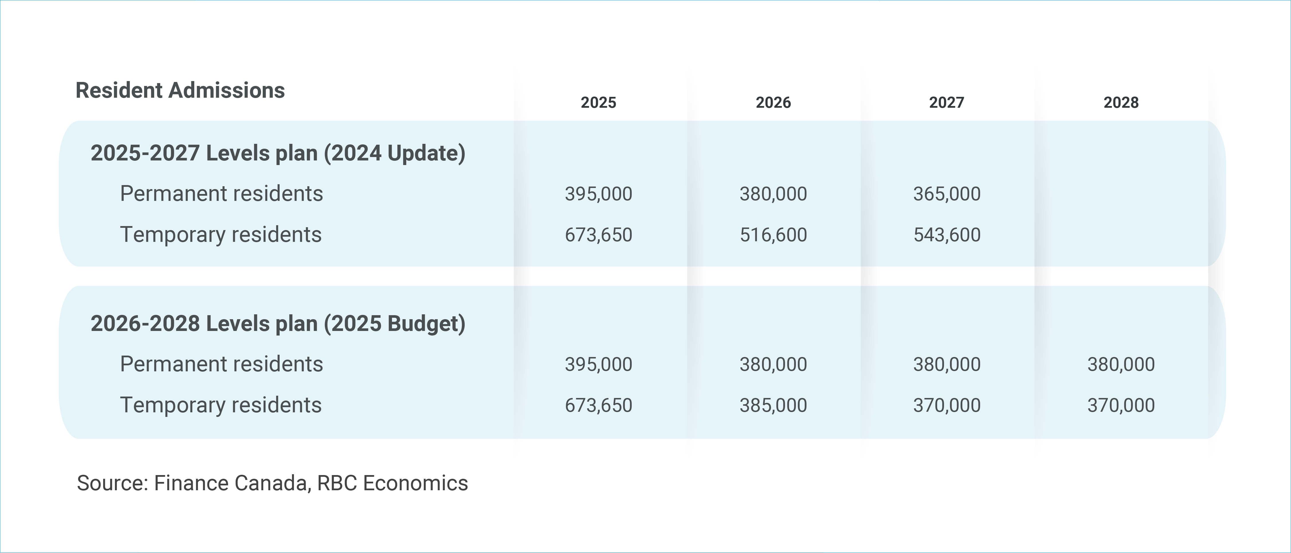 The new 2026-2028 Immigration Levels plan keeps target permanent resident admissions mostly unchanged—just lifting them slightly in the outer years. The big changes come on the temporary resident side where we previously wrote the government was falling increasingly short of its target to bring temporary residents down to 5% of the population by 2026, from the current 7.3%.