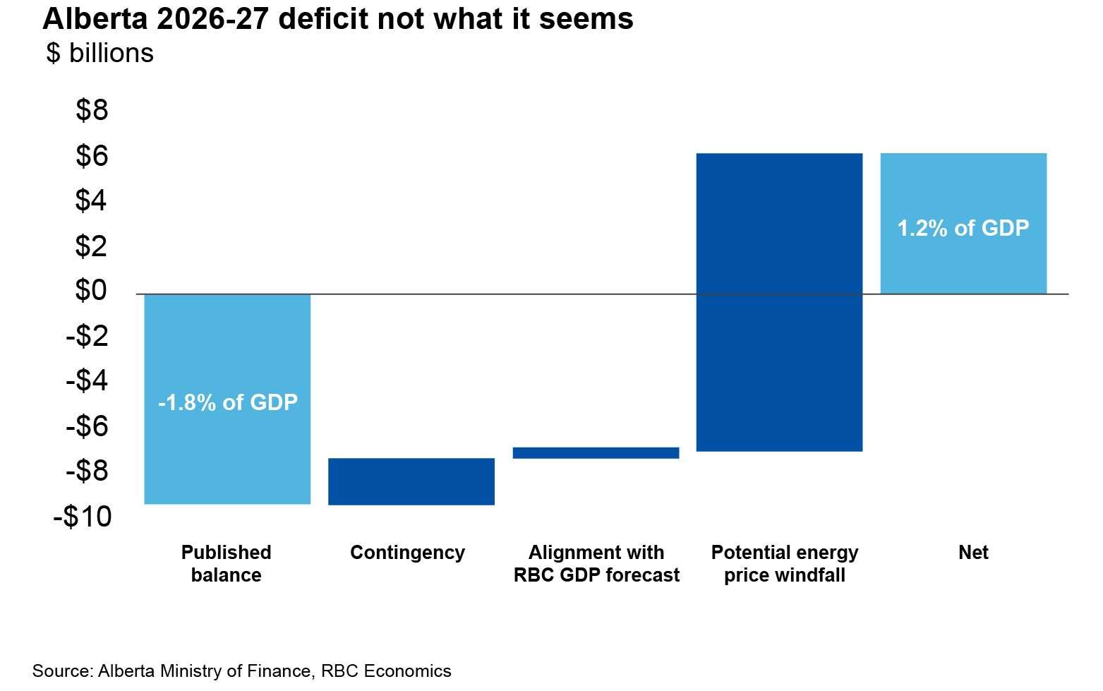 Budget assumptions were largely set before the Middle East conflict, but high oil prices could improve Alberta’s fiscal balance enough to leave the collective 2026-27 deficit much lower—closer to fall projections at only 0.6% of GDP versus 1.1% noted above (no contingencies).