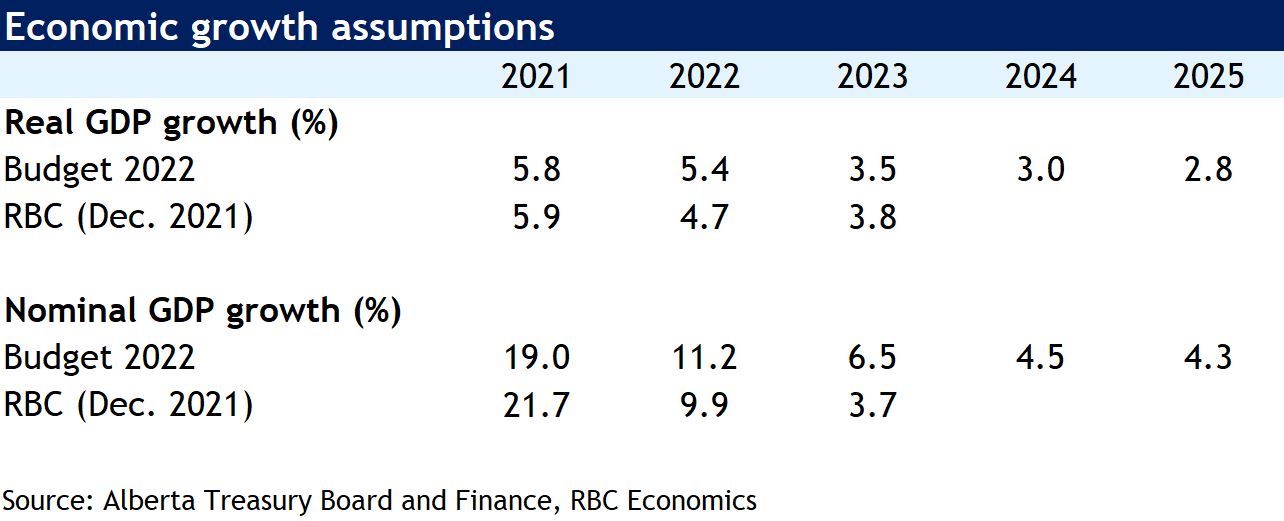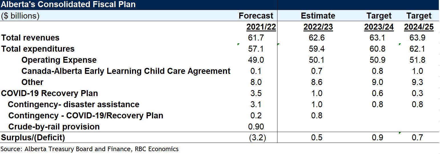 Alberta’s oil price assumption looks conservative for FY 2022-23. The government assumes an average of US$70 a barrel for WTI, which pales in comparison to RBC commodity strategists’ latest forecast of US$98 a barrel. The province thus could be looking at a further revenue windfall (of potentially up to $14 billion) if RBC’s forecast proves correct. The budget estimates that $1 increase in the price of oil generates $500 million in additional provincial revenues. Alberta may well face a much higher surplus than anticipated.
