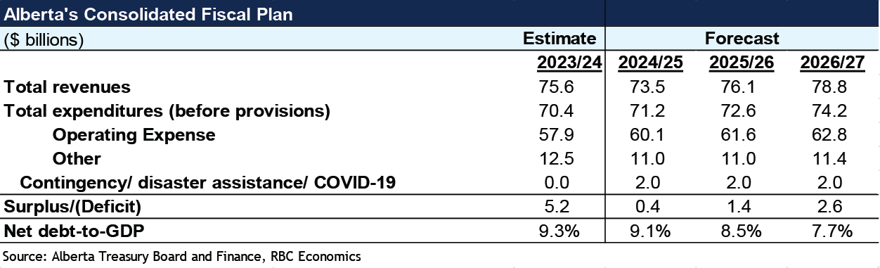 - The province announced new deposits to the Heritage Savings Trust Fund ($2 billion in 2024-25) and renewed fiscal prudence measures announced last year to combat revenue volatility.