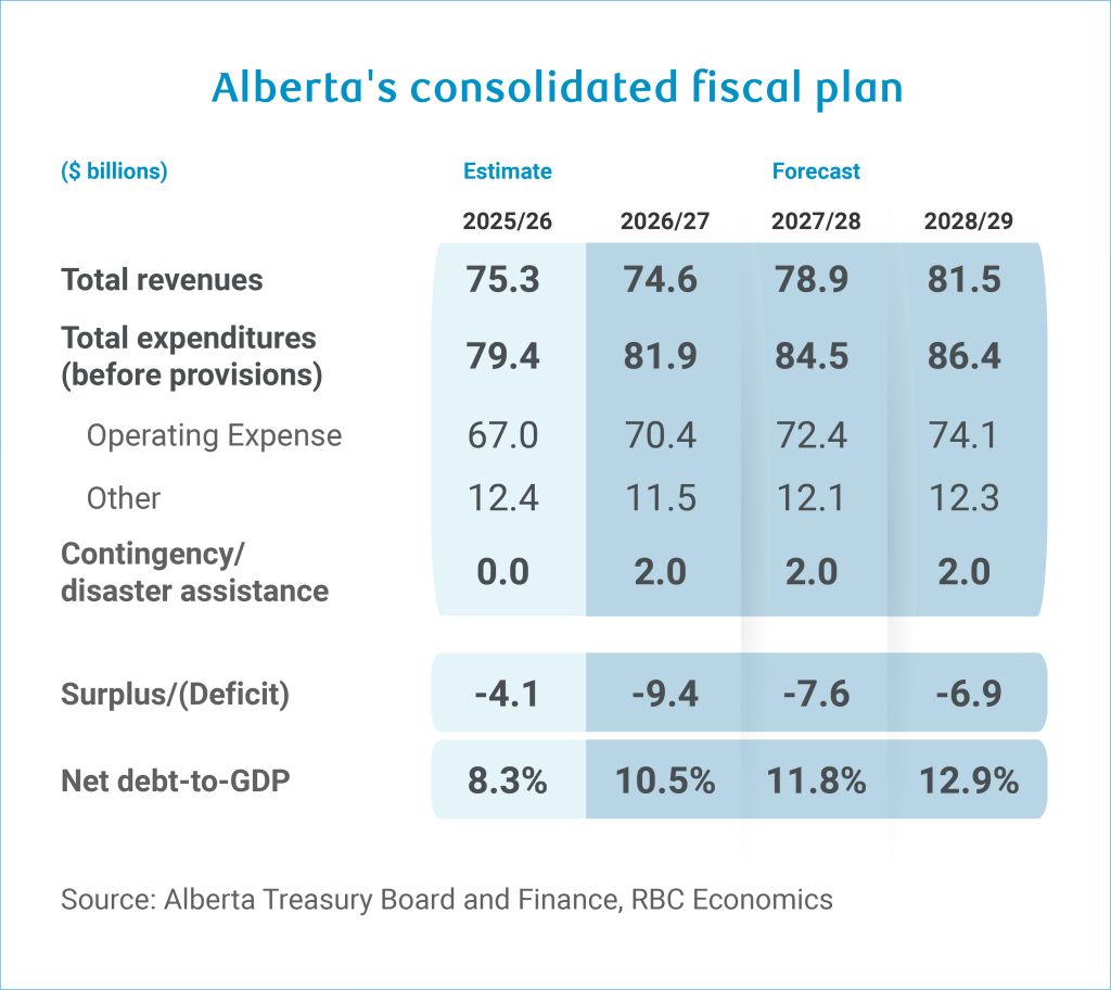 The Alberta government projects a $9.4 billion deficit in fiscal 2026-27, more than double the $4.1 billion shortfall now estimated for 2025-26.