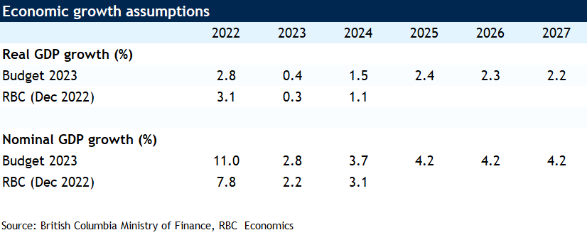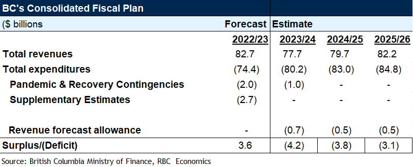 As the recession inches closer, the B.C. government continues to face downside risk to revenues. In the fiscal year ahead, B.C. projects revenues of $77.7B – a 6.1% dip from FY 2022 – 23 as the province’s corporate tax base shrinks, one-time tax settlements fall off the books, and commodity prices trend lower. Total tax revenue is expected to shrink 10.6% and natural resource revenues will likely fall 21.4% from the previous year’s forecast. Large dips in taxation revenue from corporate (-$4.6B) and personal income (-$1.8B) taxes are mostly responsible for the $5B pullback in total revenues. That, however, isn’t the only sore spot. Amid the steep housing market correction in B.C., revenues from property transfers have declined 20% ($500M) from the previous fiscal year estimate. And lower lumber prices and harvest volumes have cut the projected forestry revenues for FY 2022 – 23 in half from the prior fiscal year. Despite a projected contraction in revenues this year, total revenues for B.C. are still well-above FY 2021 – 22 actuals, with an upward trajectory in revenue growth of nearly 3% per year over the fiscal horizon.