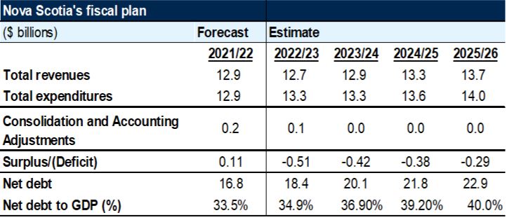Nova Scotia Minister of Finance, Allan MacMaster, delivered his first budget at a pivotal time for the province. He called it a compassionate budget with a strong emphasis on addressing health care issues and the rising cost of housing. He could have also called it steadfast. His government intends to forge ahead with boosting expenditures despite falling revenues, resulting in a $500-million deficit in FY 2022-23. It’s a significant swing from a $108-million surplus now expected in FY 2021-22. In FY 2022-23, Nova Scotia’s net debt-to-GDP will hover just below 35%, growing to 40% by FY 2025-26 as the province makes generational investments in health care infrastructure. Over the medium-term, the government projects the deficit to ease to $294 million by FY 2025-26.