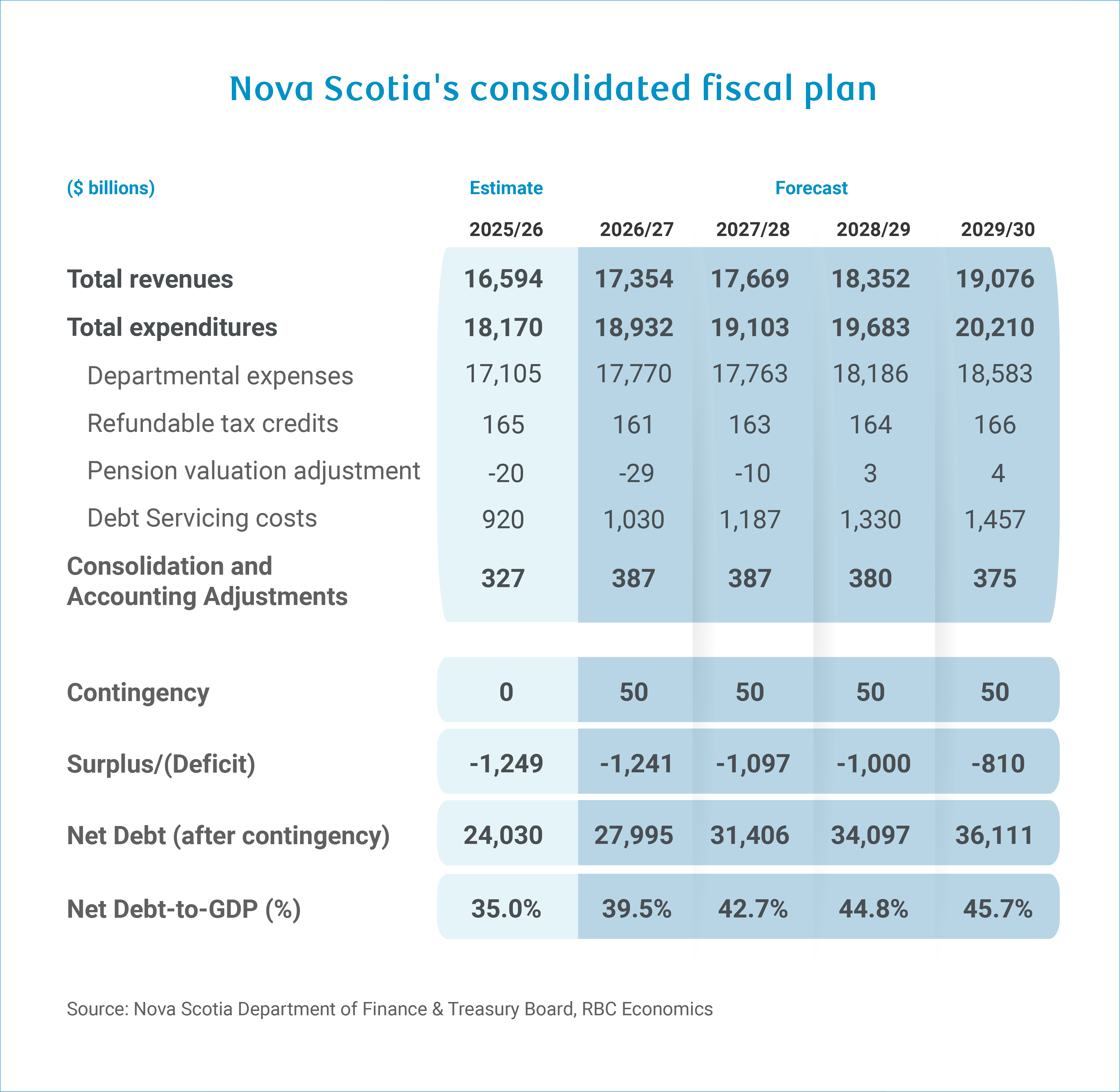 Nova Scotia’s fiscal trajectory has fundamentally shifted—and it’s taking the government on a long detour towards balancing the books. Budget 2026–27 projects a $1.24 billion deficit that will persist above $1 billion through 2028–29, a notable departure from the sharper deficit reduction path charted just one year ago that was projected to culminate in a deficit one-fifth of the billion-dollar shortfall now projected by 2028-29.