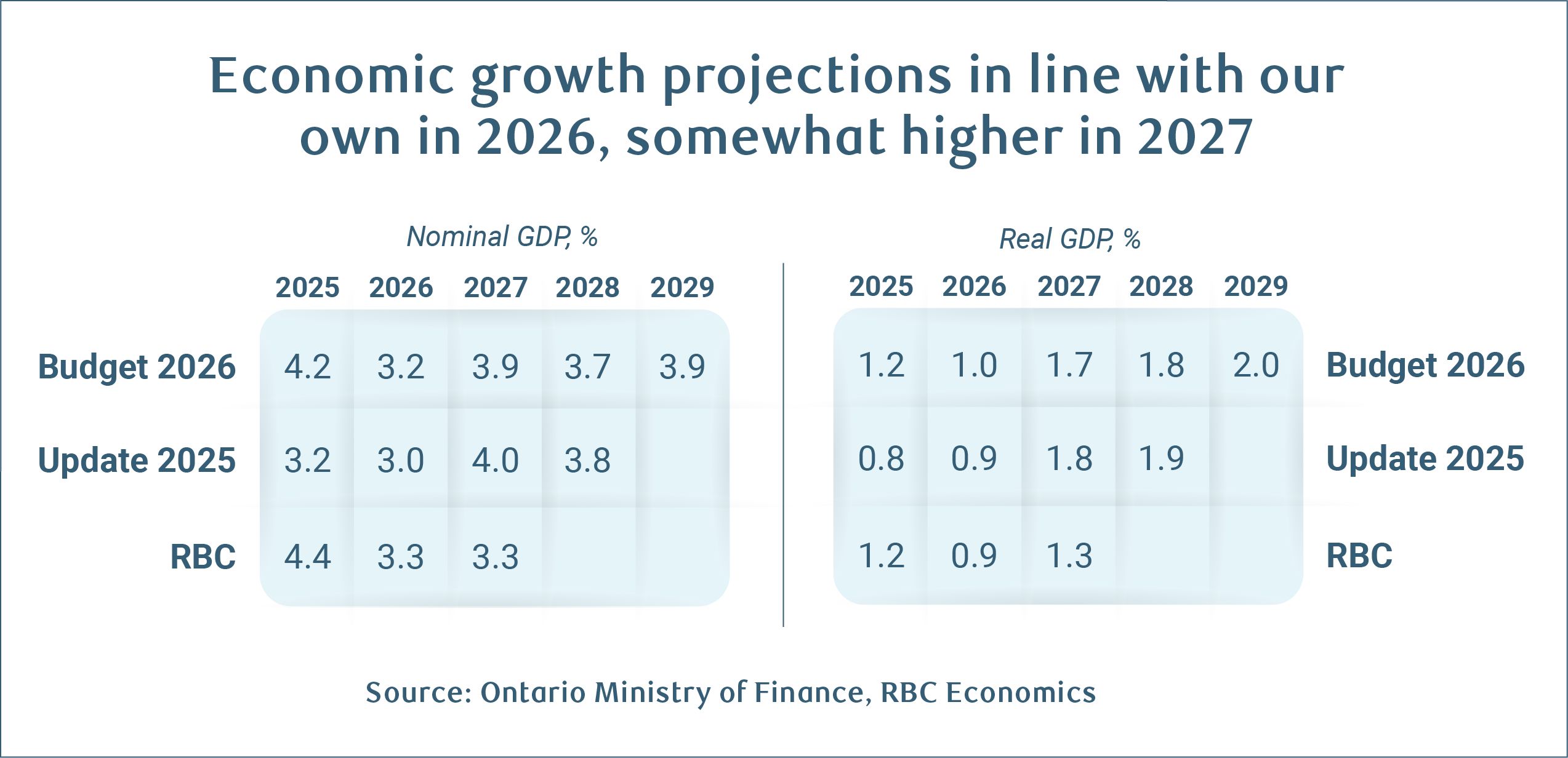• Budget 2026 expects a marginally lower deficit for the 2025-26 year that is about to end versus the fall update and prior budget – $12.3 billion (1.0% of GDP).