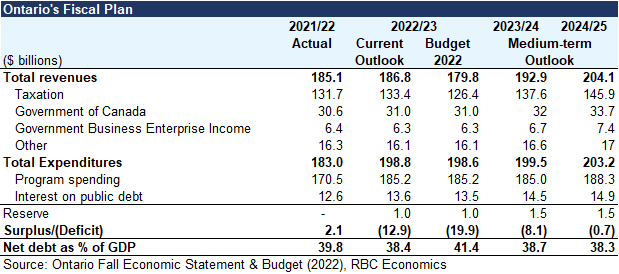Despite a mild recession forecasted in 2023, the overall budget balance is expected to improve further over the next two years. Ontario is now projecting deficits of $8.1 billion and $0.7 billion projected in 2023-24 and 2024-25, respectively.