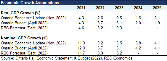 The government now assumes a mild recession in early 2023. Its base-case forecast now calls for real GDP growth to slow significantly to 0.5% in 2023, which represents a material 2.6 percentage-point downgrade from the Budget 2022 forecast. The government also forecasts nominal GDP to slow considerably next year, though remain far more above water at 3.5%. Both economic projections are very close to our September projections (growth of 0.3% and 3.2% for real and nominal GDP, respectively, in 2023).