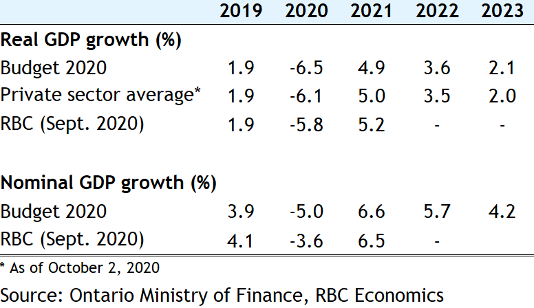 These highly unusual times make it very difficult for a government to plan ahead. Budget 2020 builds in several prudence measures to cushion against unforeseen developments, including $10.3 billion in special contingency funds in 2020-2021 (falling to $5 billion in 2021-2022 and $2.8 billion in 2022-2023), and a $2.5 billion contingency reserve (falling to $2 billion in the following two years). The budget even provides two alternative economic scenarios and corresponding deficit projections for the next two years. In the slower growth scenario (GDP growing at rates of 3.3%, 1.0% and 1.4% in the next three years), Ontario’s budget shortfall is $2.5 billion and $5.2 billion larger than the base case in 2021-2022 and 2022-2023, respectively. In the faster growth scenario (GDP growing at rates of 7.5%, 3.1% and 2.3%), the deficit is $5.4 billion and $6.9 billion smaller, respectively. The central economic scenario (shown in our table on the first page) itself is conservative—as a standard practice, the government sets the economic growth profile it uses for planning purposes slightly below the private sector’s average. While the fiscal plan isn’t shock-proof, we believe the inclusion of significant prudence measures is the right approach in the current circumstances.
