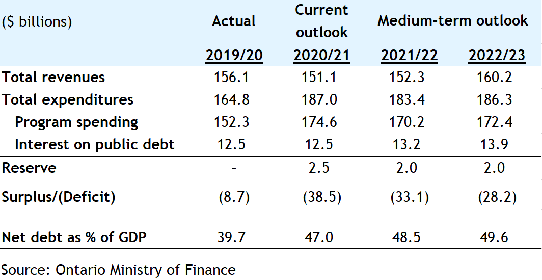 Fighting the pandemic, and helping people, businesses and the economy back on their feet will take a heavy toll on Ontario’s finances. This came out loud and clear in the 2020 budget—delivered eight months later than usual. The budget projects record deficits this year (-$38.5 billion) and in the next two (-$33.1 billion and -$28.2 billion, respectively) as spending soars and revenues drop. Net debt will balloon by $120 billion by 2022-2023. Yet this was largely expected. The fiscal update released at the end of March (in lieu of a full-blown budget) and August’s first quarter report already painted a bleak picture. If anything, the situation appears to have stabilized as the latest projection for this year’s deficit (-$38.5 billion) is unchanged from August.