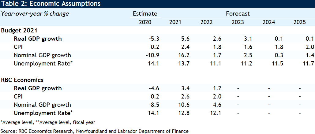 Newfoundland and Labrador’s revenues will grow by 20% this year, to $8.5 billion. This sharp increase is largely a base effect, as lower oil prices depressed revenues last year. In fact, over half of the province’s revenue growth this fiscal year can be attributed to higher offshore royalties, despite production slated to fall 5%. The projection is based on Brent crude surging 53% from 2020 to US$64/barrel and a Canadian dollar of 79.6 cents US, causing offshore royalties to more than double this year. A $1 increase in the price of oil would boost offshore royalties by $19 million (and vice versa) and a 1 cent appreciation in the exchange rate, could drive royalties down by $15 million. We find those assumptions conservative, as both are closely aligned with our RBC’s own forecasts.