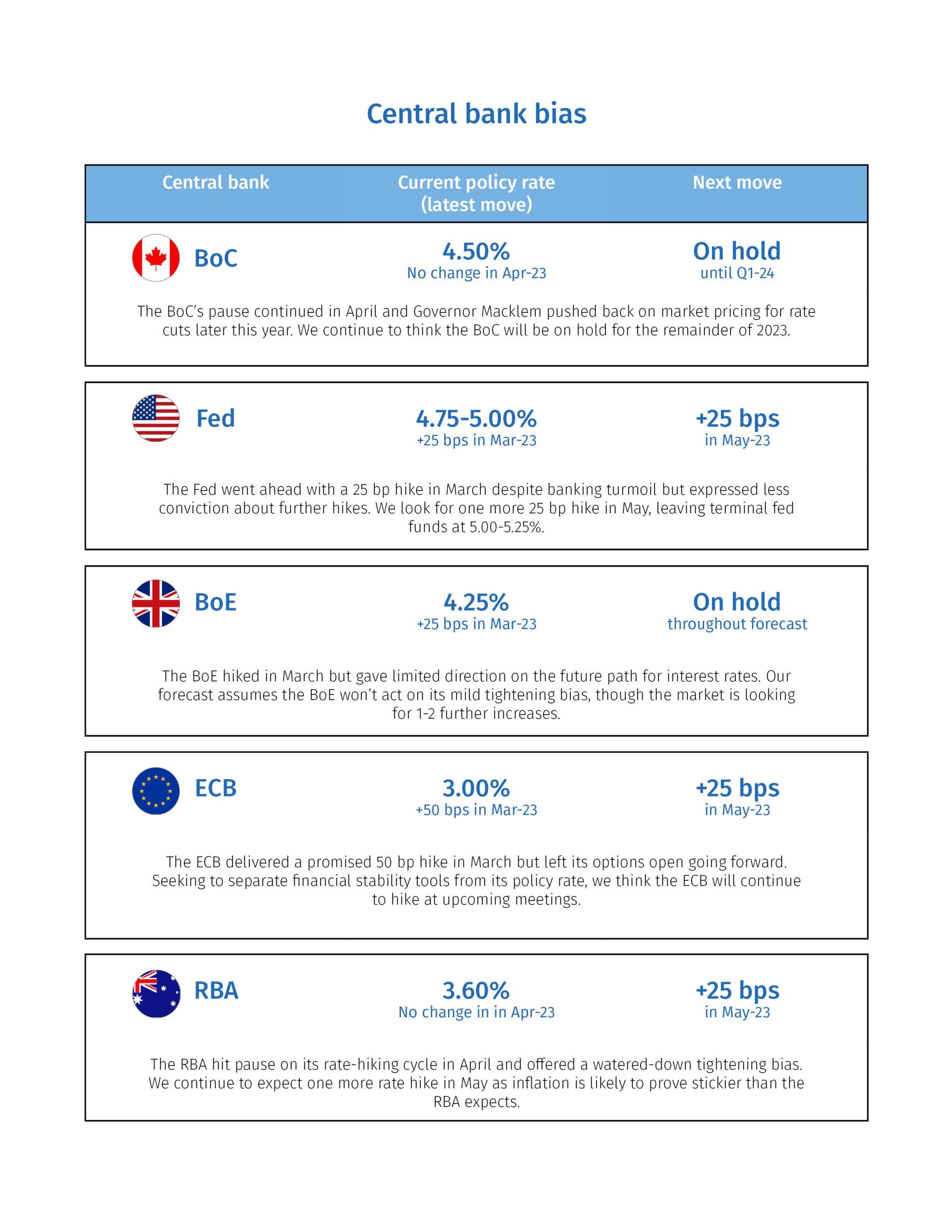 So we’re left waiting on several fronts. Banking sector concerns remain at the forefront, but calm has prevailed in recent weeks. Deposit outflows from smaller US banks have steadied, as has reliance on the Fed’s liquidity facilities. But even if the issues that have emerged thus far are the extent of it—a major assumption but one we’re making given our current knowledge—recent turmoil is likely to result in some tightening in lending conditions that could have the equivalent effect of further rate hikes. Early data has pointed to a pullback in U.S. commercial and industrial loans, and we’re anxiously awaiting quarterly bank lending surveys in the first half of May. At the same time, we continue to wait for the impact of significant rate increases over the past year to flow through to real activity. Economies and labour markets have generally remained resilient, but cracks are beginning to form and key sources of price pressure (including in some cases wages) are easing. While other central banks have yet to join the BoC in signaling a firm pause, we think most will soon conclude it’s time to move on from raising rates.