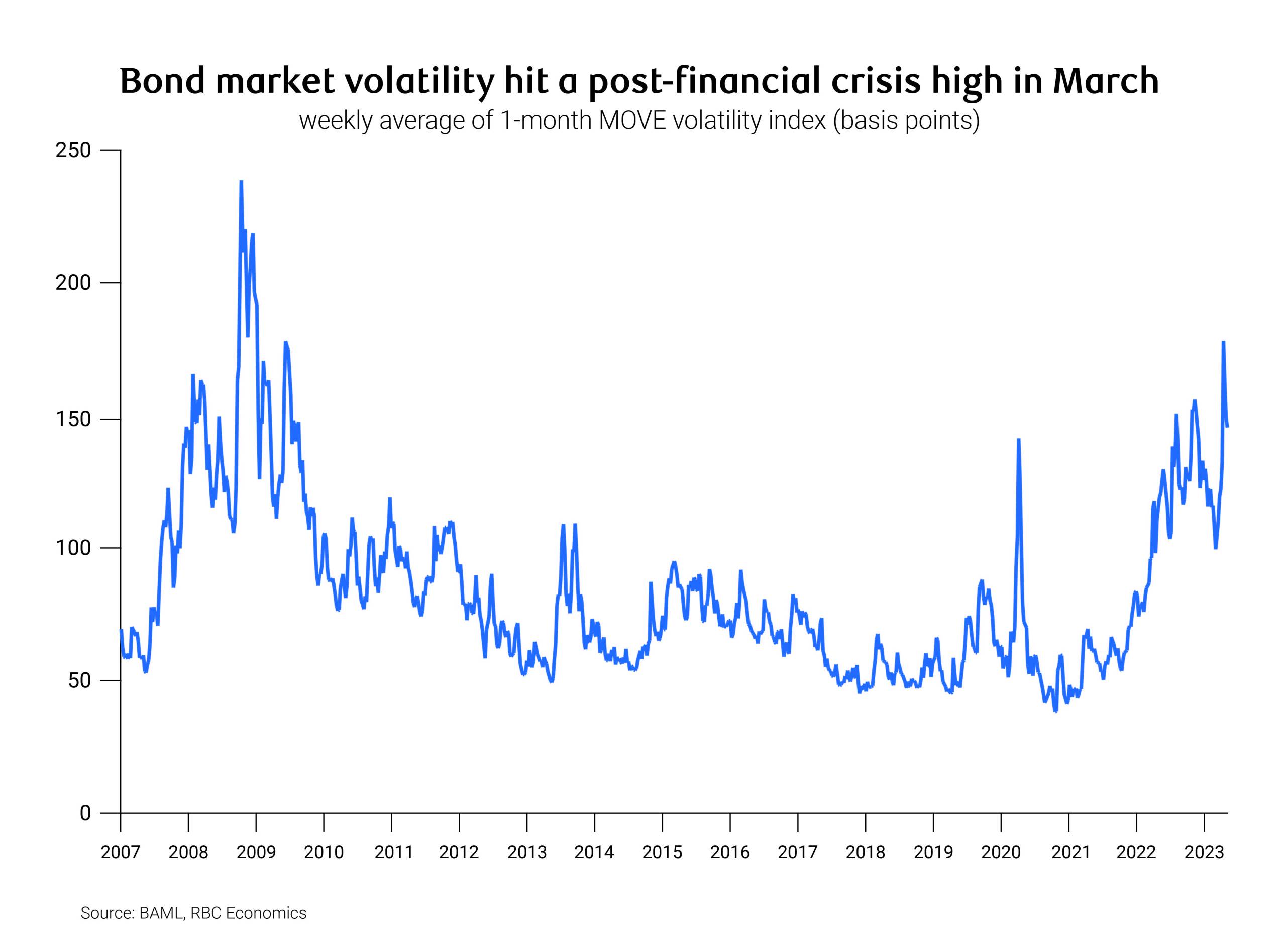 Financial stability concerns caused significant market volatility in early March. Flight to safety and market pricing shifting from rate hikes to cuts put significant downward pressure on government bond yields. While that generally means easing financial conditions, it was more than offset by rising credit spreads and declining equity markets. On net, we think market moves in early March netted out to the equivalent of 1-2 rate hikes by the BoC. But with equities rallying in late-March and credit spreads coming off their highs, much of that net tightening was reversed by month end. It’s still notable, though, that even with government bond yields fallings sharply last month, we haven’t seen any easing in overall financial conditions.