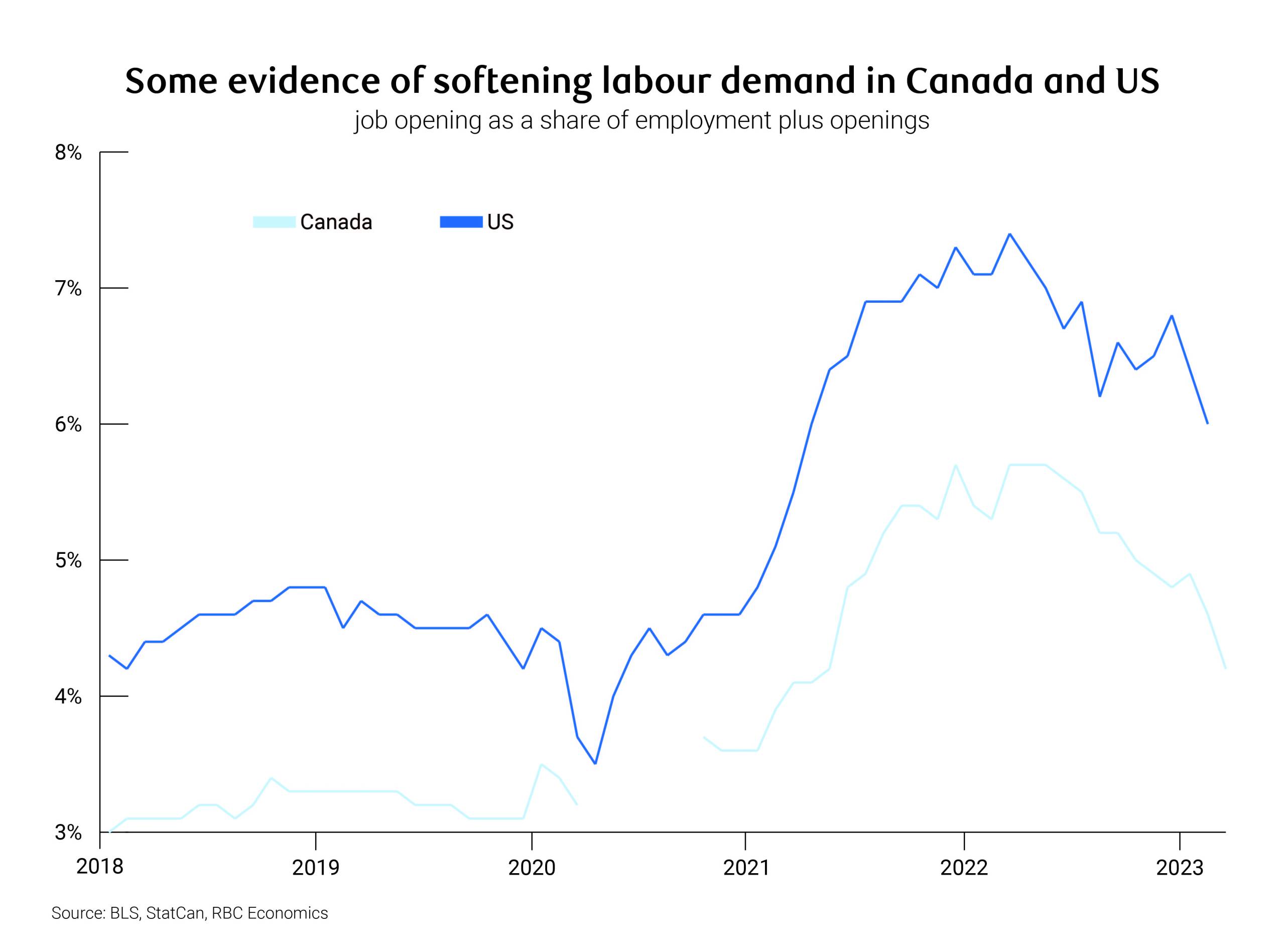 After a lacklustre end to 2022—Q4 GDP was flat—it looks like Canada’s economy regained some momentum early this year. GDP gains in January and February point to annualized growth of around 2.5% in Q1. That’s close to the economy’s potential, implying no further progress in reducing excess demand. Employment data remained firm as well, with job gains averaging nearly 70,000 per month in Q1, twice the average pace seen in 2022. Canada’s unemployment rate hasn’t budged from a near-record low of 5%, and year-over-year wage growth above 5% remains too strong for the BoC’s comfort. That said, monthly wage gains show some signs of slowing and moderation in job openings also suggests excess demand for labour is beginning to ease.