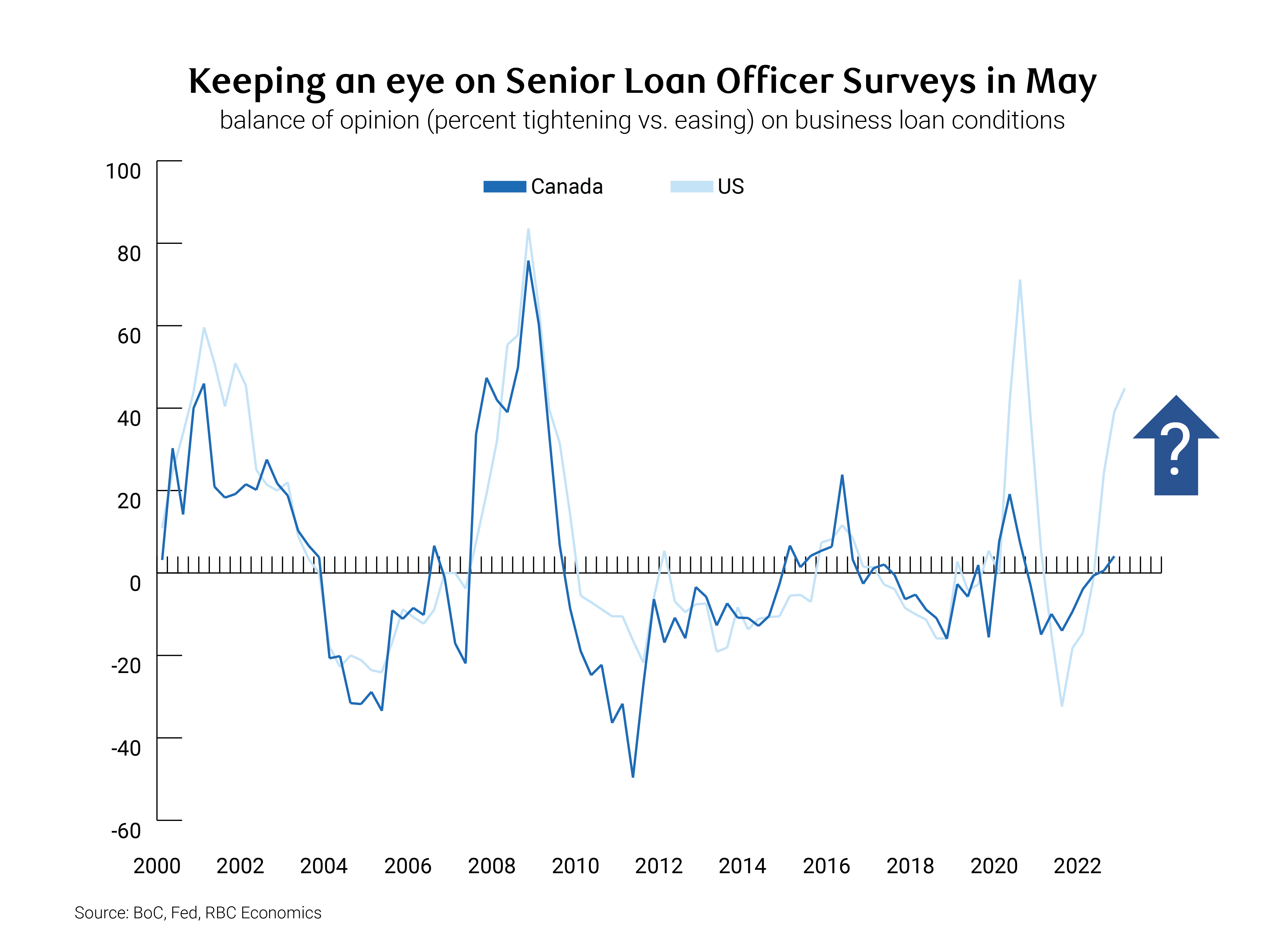 And there could still be some tightening in financial conditions in the pipeline. One key indicator we’ve yet to see is the BoC’s quarterly Senior Loan Officer Survey (SLOS). The next release on May 12 will show the extent to which lending conditions have become more restrictive in the wake of global banking concerns. The latest (Q4) survey already showed some tightening in business lending standards, particularly on the price side (which measures spreads and fees, not outright interest rates). It’s safe to assume we’ll see some further tightening in that regard, though the extent is uncertain. In any case, we think tightening in Canadian bank’s lending standards will be less than in the US given the latter’s more direct exposure to banking turmoil. The Fed’s own SLOS already showed more significant tightening prior to recent developments, and we’ll be closely watching the next iteration in May.