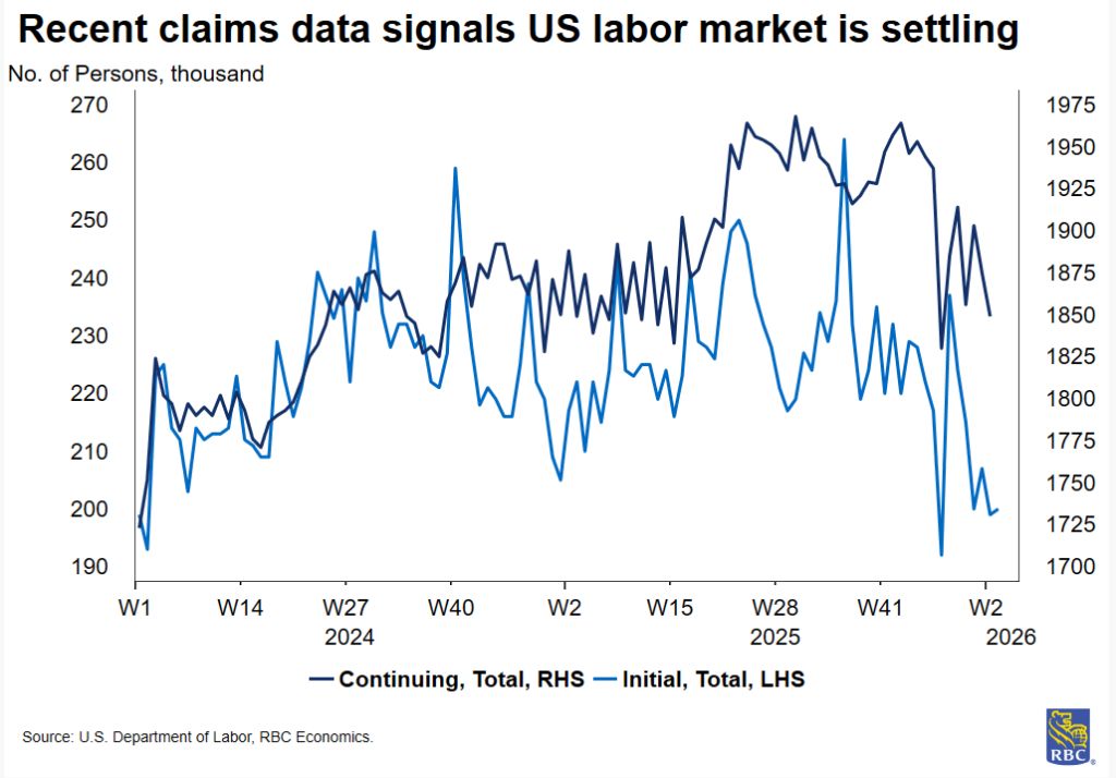 We expect initial jobless claims will come in slightly lower for the week ending January 24th, at 195k. This is consistent with the labor market stabilization that we are seeing take hold along with seasonal trends, as claims tend to trend lower towards the end of January.
