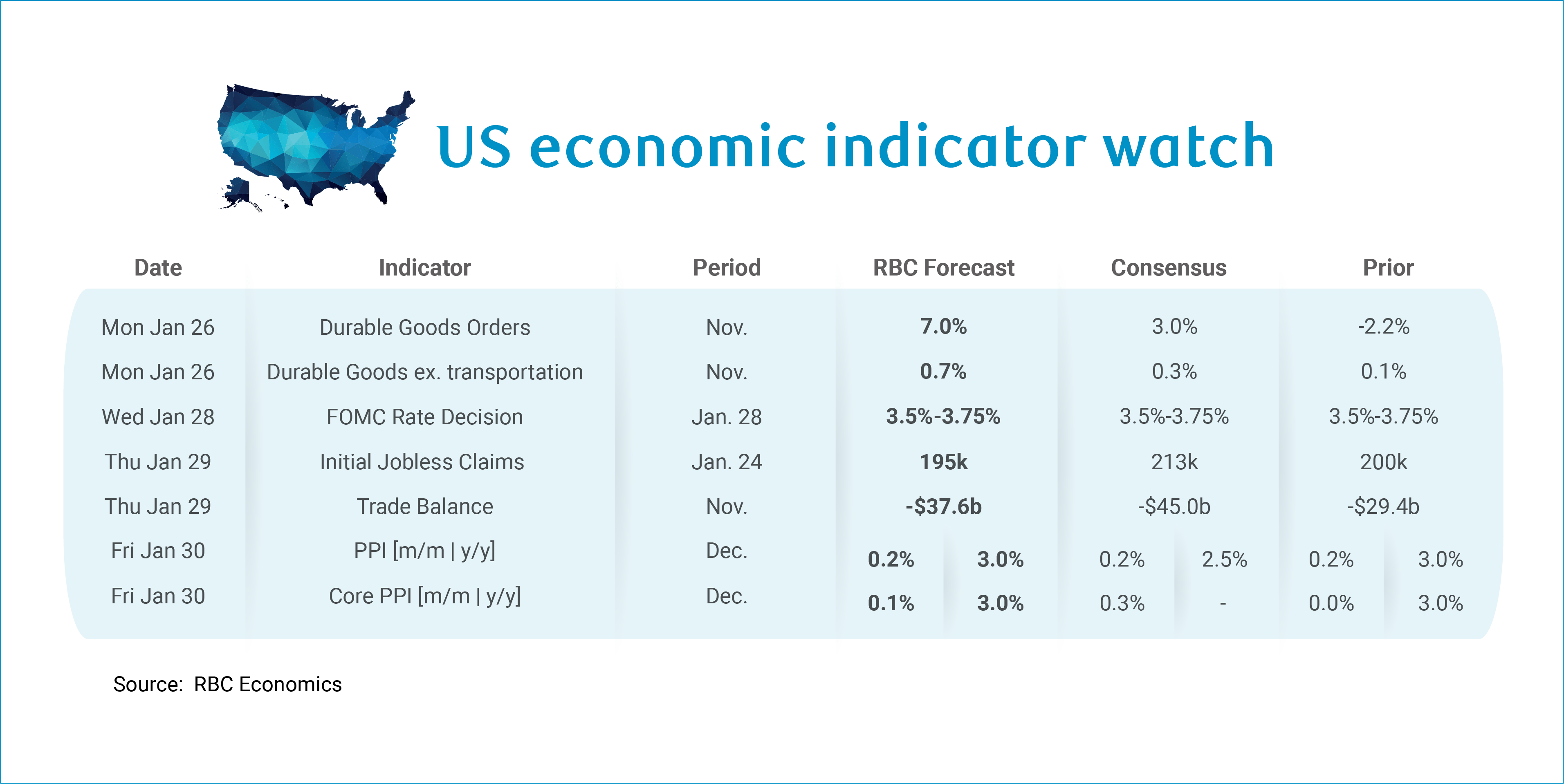 This week, the headlines from the World Economic Forum in Davos and subsequent market turmoil garnered more attention than macroeconomic data. Now that the dust has settled and market participants are breathing a sigh of relief – for now – Wednesday’s FOMC meeting will be the focus next week. We anticipate, however, that the meeting will be largely uneventful, at least from a policy standpoint. We expect the Fed will move to the sidelines as data on both sides of the Fed’s mandate have moved in a more favorable direction.