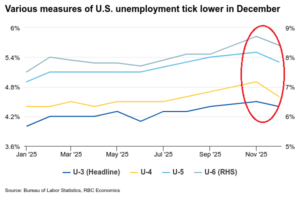 The unemployment rate ticked lower to 4.4% from November’s revised level (4.5%). We previously estimated the 2025 breakeven employment rate to be around 40K per month, so a 50k print does help push the u-rate lower in that regard.