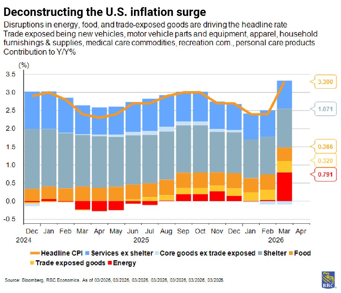 Higher gas prices sent headline inflation soaring in March as the monthly rise (+0.9% m/m) was reminiscent of 1970s inflation. The silver lining is core inflation remained subdued, rising a modest +0.2% m/m. The continued slowdown in core inflation will provide some term relief for the Fed. But the risk remains that higher energy prices could start to spill over into the broader economy if the conflict in the Middle East persists. Higher oil risks pushing transport costs up and continued tariff effects are layering additional pressure onto core goods. As we’ve been highlighting, prices for trade exposed sectors, including auto parts, apparel, personal and recreational goods continued to rise at an uncomfortable pace. For the Fed, the question remains how businesses will react to the oil price shock: will they continue to pass on higher prices to consumers or will they protect margin compression through layoffs? For now, the Fed will have to remain data dependent before they decide their next move.