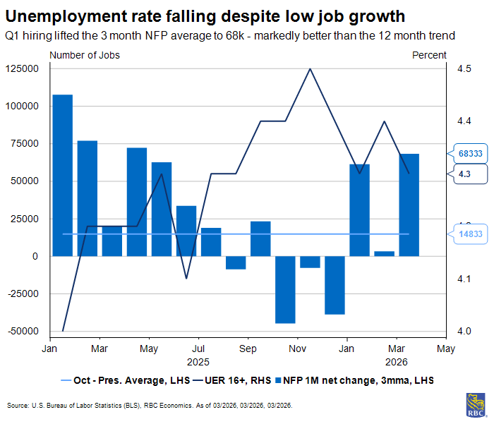 Construction hiring rebounded after a particularly cold February, driven largely by nonresidential construction (largely a data center story). So too did leisure and hospitality and retail sales, both reflective of a US consumer that continues to spend despite the uncertainty ahead. The most important takeaway from this report should be an appreciation for how low the breakeven rate of payroll growth has fallen (i.e., the number of job gains needed to keep the unemployment rate steady). Even though the labor market has averaged ONLY 15k jobs per month since October, the unemployment rate fell from 4.5% to 4.3%. Importantly, this employment report gives the Fed more time to assess incoming inflation data, and we expect they will remain on pause as their dual mandate faces growing tension.