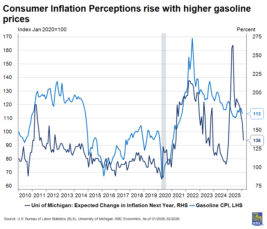 Headline inflation has now exceeded 2% for nearly five years while tariff pressures already threaten to keep it above target. Higher oil prices would compound this challenge, pushing inflation further away from 2%. As our Head of Global Commodity Strategy and MENA Research, Helima Croft, has emphasized, “[…] Duration will be the determining factor of the ultimate price trajectory for energy.” Over the past few days, we have witnessed $100/barrel realities and immense volatility. If prices were to return to $100/barrel and settle there, this would drive headline inflation meaningfully higher, by our own calculations, to above 3.5% by Q2 and remaining at that level throughout the year. This would add 0.7 percentage points to our forecast for headline inflation.