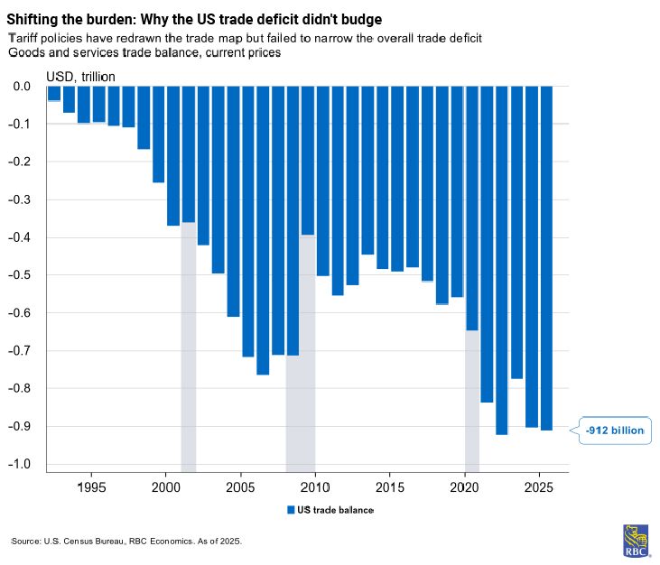 The US reported a record $1.23 trillion goods trade deficit in 2025. The structural explanation is straightforward: Tariffs successfully reduced imports from primary targets (especially China), but import demand was irreplaceable, and buyers redirected sourcing elsewhere, leaving the aggregate measure unchanged.