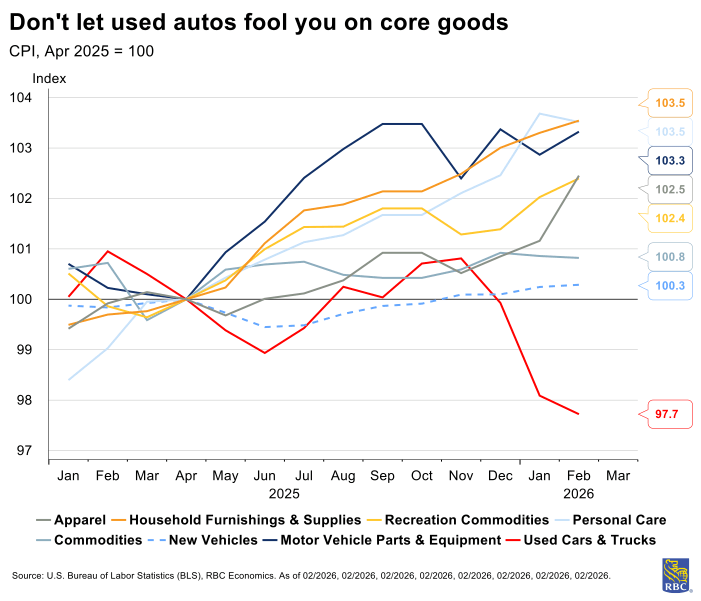 Stripping out used cars and trucks, prices have risen in a few notable trade-exposed sectors including motor vehicle parts and equipment, household furnishing and supplies, personal care, recreation commodities, and most-recently, a spike in apparel suggesting pre-tariff inventories have been largely used up.