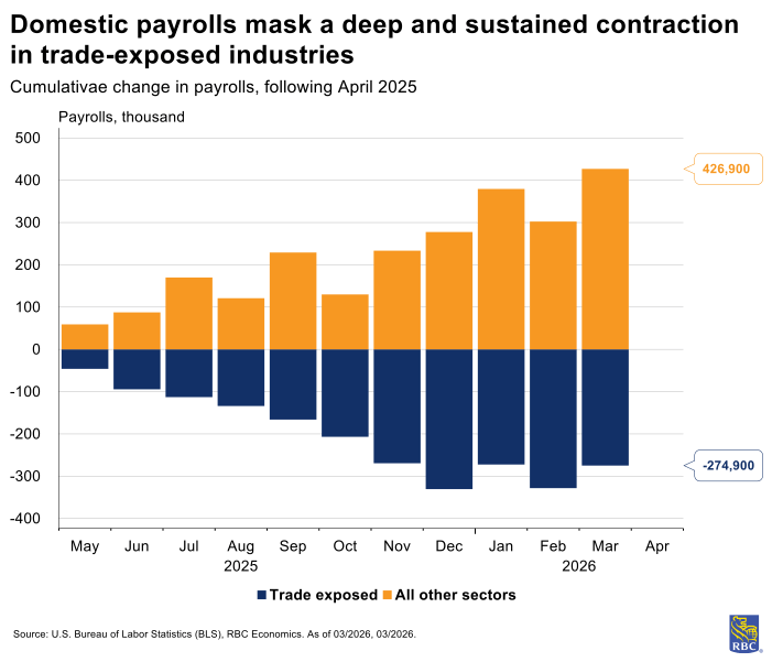 No evidence of reshoring and trade reliant sectors are shedding jobs