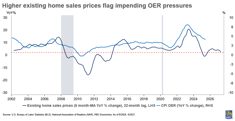 Leading indicators of OER suggest some near-term reprieve, but then, upward pressure through mid-2026, which will put a floor under how far CPI can fall.