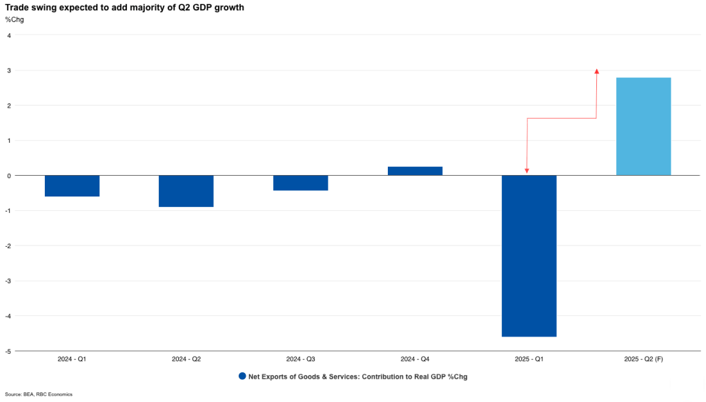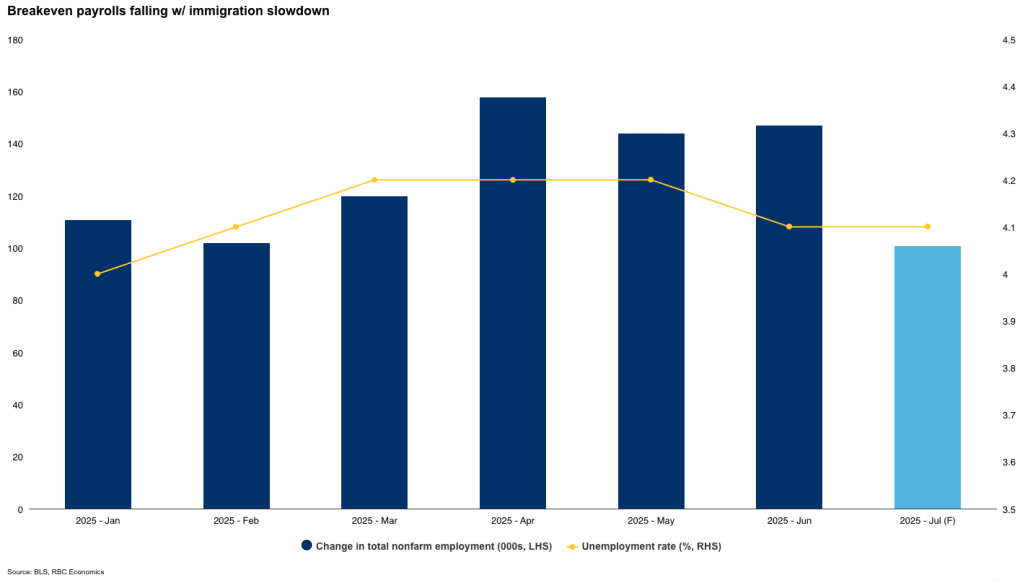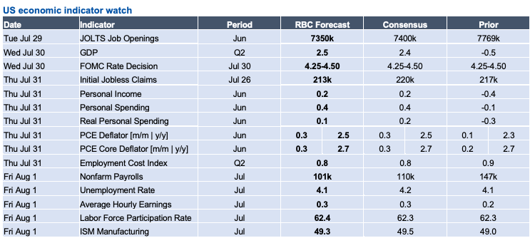 Next week’s FOMC meeting (Jul 30) is likely to be completely overshadowed by the slew of economic data on the calendar. The Q2 GDP report and the employment report will be the data highlights, but neither is likely to move the needle for the Fed as it relates to a shift in their economic narrative. We expect to see Q2 GDP growth rebound to 2.5% as the import surge subsides and consumers maintain positive real spending. To that end, we look for the labor market to remain tight with the unemployment rate holding at 4.1% and payrolls adding 101k jobs in July. While 101k certainly represents a slowing relative to the gains seen earlier this year, it comes at the same time as an immigration slowdown, which means the breakeven rate (i.e., the level of payroll gains needed to keep the unemployment rate steady) is falling. Additionally, we expect initial jobless claims to remain at low levels, after surprising to the downside this week, a reflection of the low firing environment that continues.