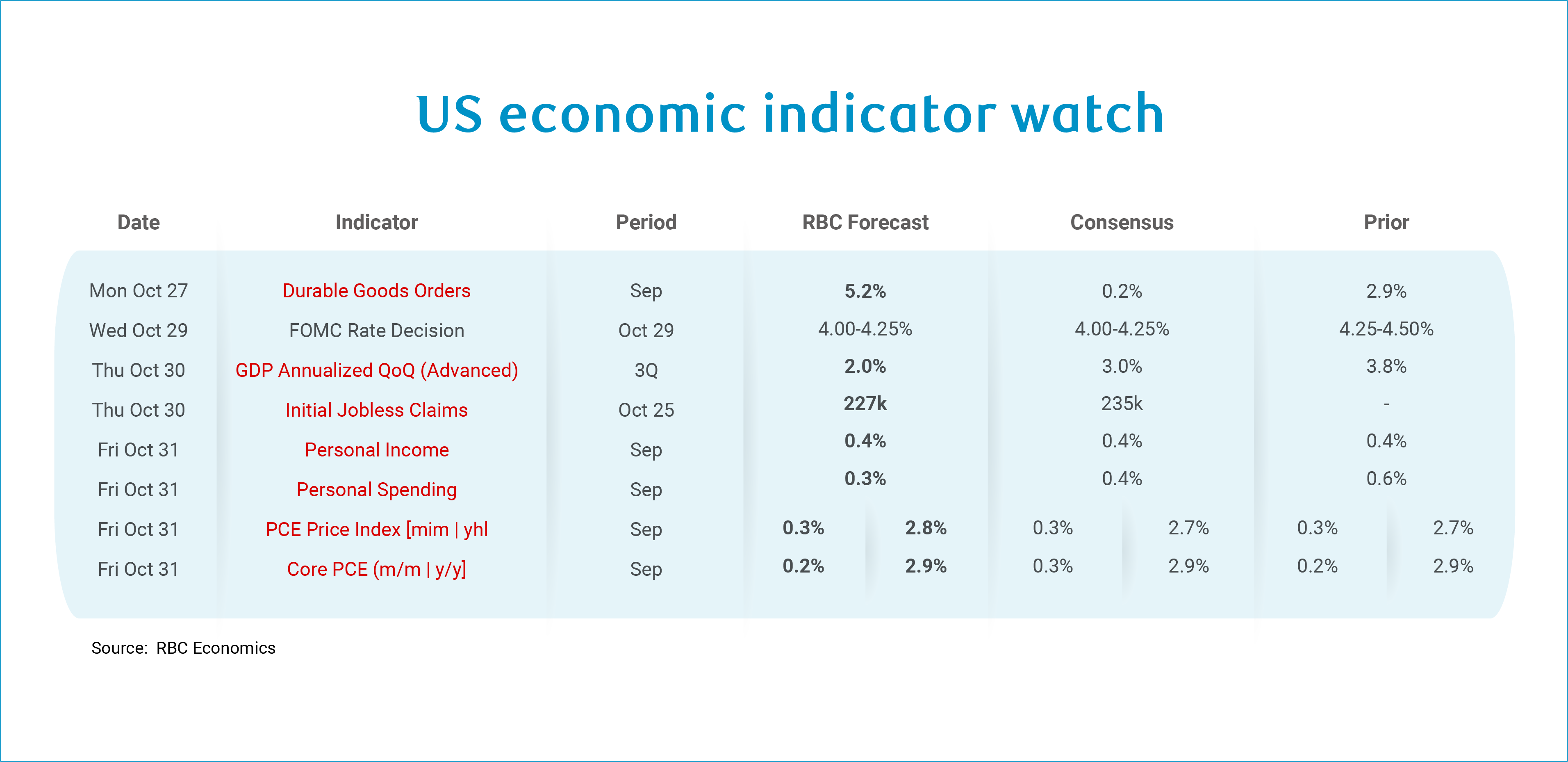 We are entering into the fourth week of the US government shutdown. We are continuing to publish our forecasts, with the government data highlighted below in red – this data will not be released during the shutdown.