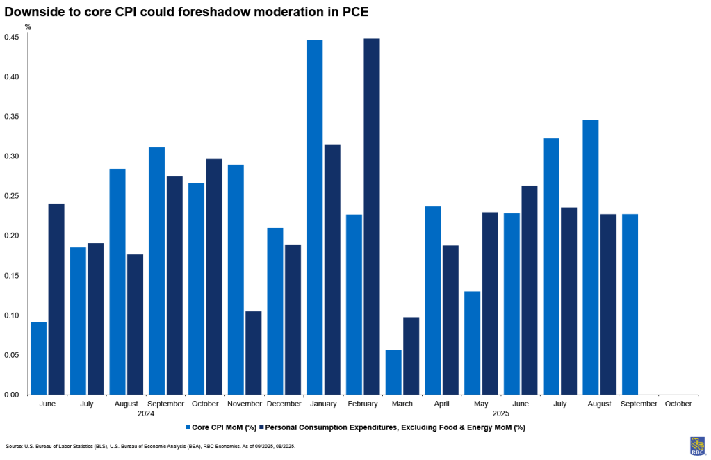 The September inflation release pointed to increasing signs of tariff pressures materializing, though a reprieve in OER helped moderate the core index. However, given differences in weighting, the housing component is less significant in PCE and this poses upside risk to the core PCE measure of inflation, especially if health care services measures of PPI come in higher than 0.1% month-over-month. Still, we expect core PCE to tick up by a modest +0.2% m/m in September, as we continue to see upward pressure in the CPI data in tariff-exposed sectors. And higher food and energy prices mean monthly growth in headline PCE should outpace core growth in September. At the same time, retirees and higher income consumers continue to support services spending, limiting the downside to core services inflation while the impact of tariffs continues to permeate through core goods. We expect these pressures to mount in tandem in the first half of 2026, with inflation peaking in Q2.