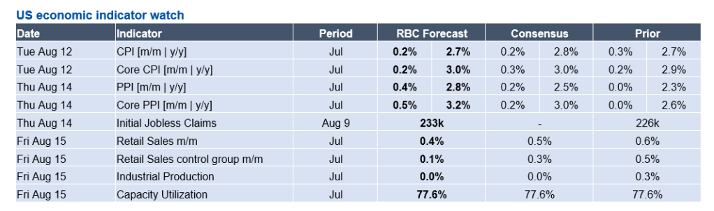After last week’s substantial NFP revisions , all eyes will be on Tuesday’s CPI print as market participants and economists assess the likelihood of a September rate cut – now back on the table as labor market weakness is more pronounced than previously thought. Still, the Fed remains focused on inflation and should next week’s print come in hotter than expected, it could derail the Fed’s ability to cut interest rates at the September meeting. While we do expect to see an uptick in both core and headline inflation, we do not anticipate that next week’s data will fully capture the impact of tariffs on consumer prices. Our forecast calls for a 0.2% m/m rise in core inflation in July, pushing the y/y pace to 3.0%. We expect to see continued upward pressure from core goods – we are looking for a 0.4% m/m rise. The increase will likely be seen in trade-exposed sectors like motor vehicle parts and equipment, apparel, and recreation commodities (i.e., toys) but July’s data will be far from capturing the full extent of tariff impacts. We do expect to see more pronounced price pressures emerge in PPI before we see material passthrough to consumer prices in the coming months. We forecast next week’s core PPI will post a notable 0.5% uptick, with pressure heating up in finished consumer goods alongside trade services and transportation and warehousing. With a more modest 0.4% m/m rise, we expect headline PPI inflation will be helped by cooling energy prices, but core pressures should be the focus as tariff pressures permeate domestic supply chains.