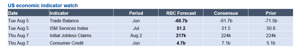 We expect to see a slightly weaker jobless claims print, however, though this is reflective of the continuation in the low-firing environment rather than an improvement in labor market conditions. While this morning’s leisure and hospitality hires were exceptionally weak and Q2 services GDP prints illustrated a weakening consumer barometer, ISM services has held up and is expected to continue to hold up, at least for now.