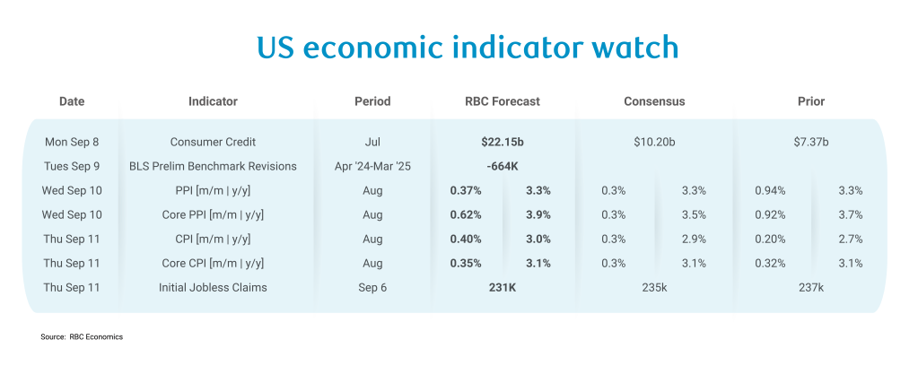 After a week focused on the deterioration in the labor market – which we think is bad but not ugly (see our comments here) – this coming week turns to the other side of the Fed’s mandate and where the more uncomfortable story lies. At the center, August CPI data is expected to show that inflation data is heating up further. We are continuing to grapple with upward pressure from both services and now core goods – as we expect tariff pressures to begin to materialize in the August data. With this in mind, we have core inflation still sitting at 3.1% y/y. Headline inflation is likely to rise to 3.0% – as upward pressure from food PPI in July is expected to show up in the CPI data this month. Pair this with upward pressure from gasoline on a seasonally adjusted basis, and we are likely to land at our Q4 headline target early. This poses upside risk to our headline inflation forecast for Q4, if we are correct and PPI pressures from food drive headline notably higher.