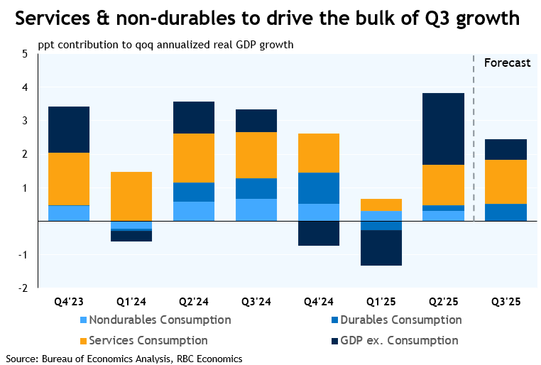 Heading into the next week, GDP data will be front and center. Our forecast calls for real GDP growth to come in +2.5% at a quarter-over-quarter annualized pace in Q3, with a bit of upside risk given uncertainty around inventory levels. We know that consumer spending eclipsed Q2 by a slight margin, as services spending continued to be supported by high income earners and spending on nondurables ramped up meaningfully. Durables spending, on the other hand, was entirely flat, after a Q2 pull forward in spending (accompanied by a downshift in savings rates) in the face of tariffs. September trade data pointed to slightly weaker imports in Q3, again, a product of an earlier pull forward, alongside a ramp up in exports. Adjusting for nonmonetary gold imports could nudge Q3 GDP higher. Inventories will be another wildcard and could move the needle meaningfully, after we saw distortions in earlier quarters.