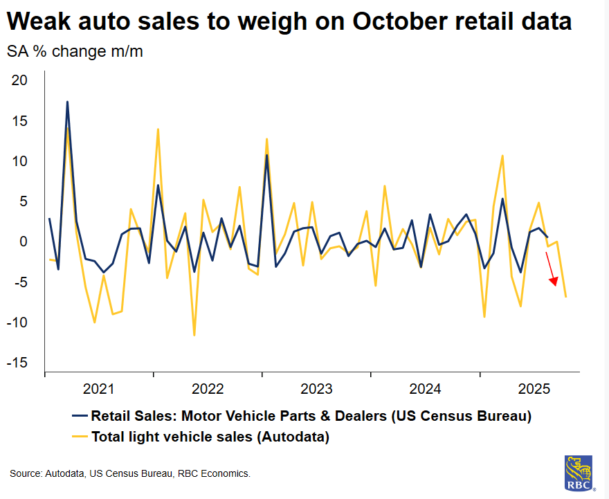 Retail sales activity likely slowed in the month of October – we expect to see a pullback in the overall metric (-0.8% m/m) with a +0.3% uptick in the control group (which excludes autos, gasoline, building materials and restaurants) rendering real retail sales (control group) flat after netting out inflation. Both auto sales (Ward’s auto sales fell -6.5% m/m in October) and gasoline sales are expected to weigh on retail activity this month and the prolonged impact of the government shutdown will not help. Federal employees to-date have lost ~$27 billion in wages that are expected to be back paid at a later date – by our calculation, this will likely shave a few tenths off of real GDP in Q4 but could weight more meaningfully on activity should the shutdown last through the month.
