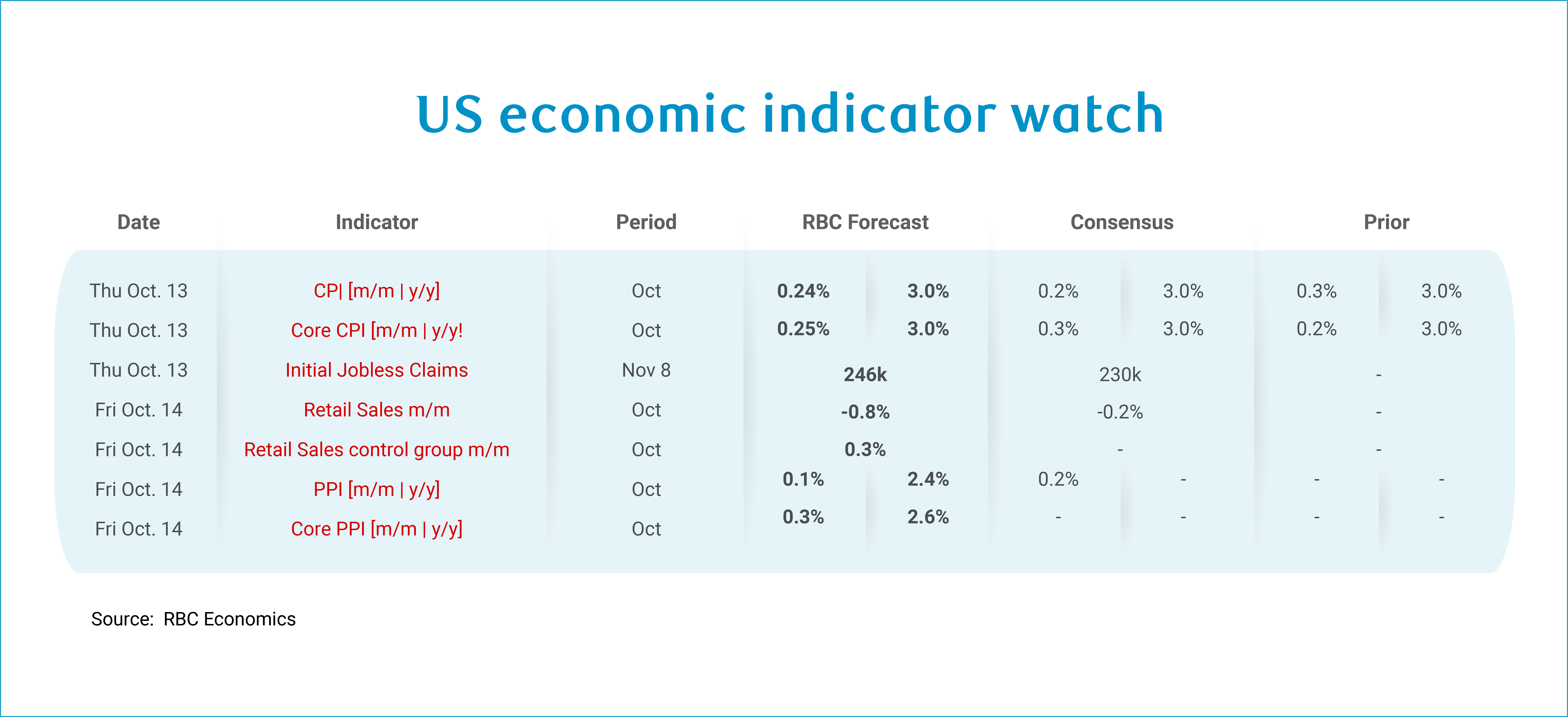 Core PPI is expected to tick up +0.3% m/m which would lower the headline number to +2.6% y/y. A pullback in energy prices will help this month. We expect transportation and warehousing prices will continue to weigh on the overall index, but seasonal factors will help for this sector in October.