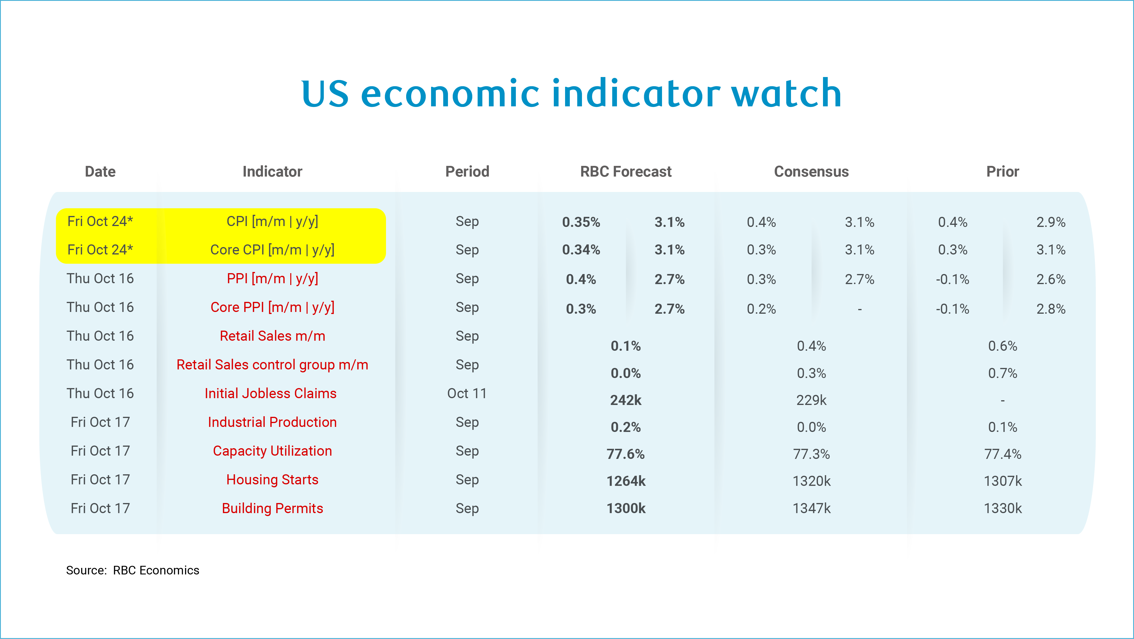 The continuation of the US government shutdown means another week of minimal data in what otherwise would have been a critical week for data releases. We continue to publish our usual forecast table, highlighting in red the government data that is unlikely to be published. However, a press release from BLS indicates that CPI will be released on Friday, Oct 24 at 8:30am ET. But don’t get your hopes up for additional data – the release specifies that this relates to the annual COLA calculation need for social security 2026 payments. No other data reports will be released by BLS.