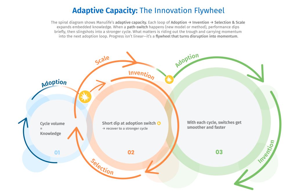 Together, these routines formed Manulife’s innovation flywheel: adoption experience generated invention; selection routines filtered the noise; flexible architecture enabled safe path-switching; and the loop restarted with each cycle stronger than the last.