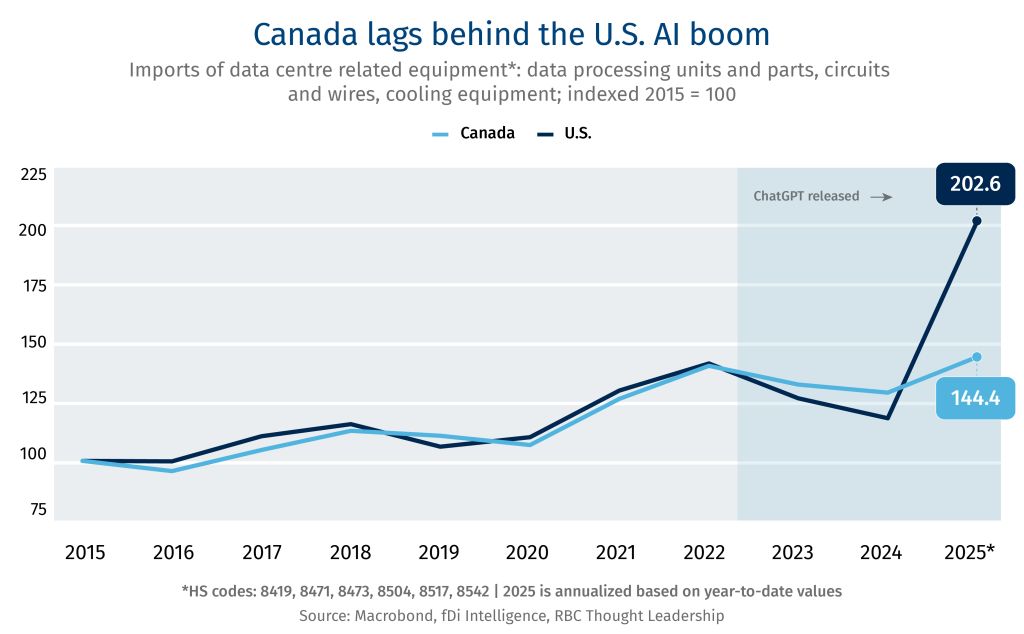 AI-related investments may have masked the impact of the U.S. trade war on global growth so far, the IMF notes in the latest World Economic Outlook. Since the release of ChatGPT in late 2022, U.S. firms have quadrupled data-centre construction spending to nearly US$40 billion. There are now 5,000 data centres dotted across the U.S. Imports of data centre related equipment is up 50% over the same period. Taiwan accounted for half of the growth when it comes to U.S. imports of digital processing units. Canada, as the chart below indicates, has remained on the sidelines of the AI boom despite a growing number of data centre applications. Demand for related equipment has shown only a small uptick in recent years.