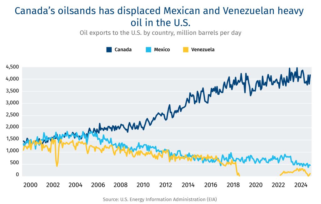 As U.S. President Donald Trump hosted Prime Minister Mark Carney and Mexico’s President Claudia Sheinbaum, energy issues loomed in the background amid U.S. concerns about structural deficits in heavy crude. Historically, Canadian barrels competed with Venezuelan heavy crude in key U.S. refining markets—primarily the U.S. Midwest and the Gulf Coast. While Venezuelan volumes have been largely absent for the past decade, shifting U.S. foreign-policy signals suggest that competition could re-emerge.