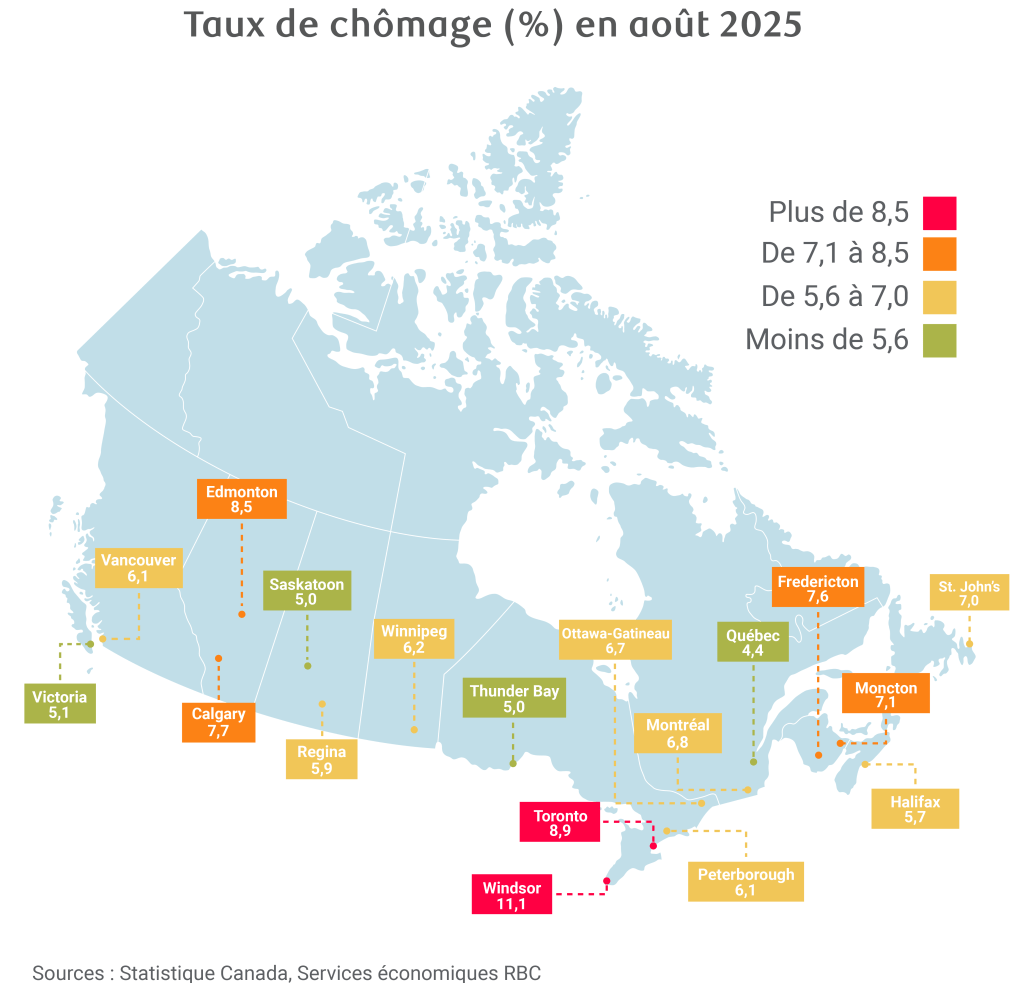 Licenciements limités : La hausse du taux de chômage est surtout attribuable à l’allongement de la durée de recherche d’emploi pour les nouveaux venus sur le marché du travail. Le taux de chômage chez les jeunes, en particulier, a fortement augmenté. En revanche, la croissance du nombre de chômeurs résultant de mises à pied permanentes a ralenti pour s’établir à 4,7 % d’une année sur l’autre en août, contre 19 % et 24 % en 2023 et 2024, respectivement.