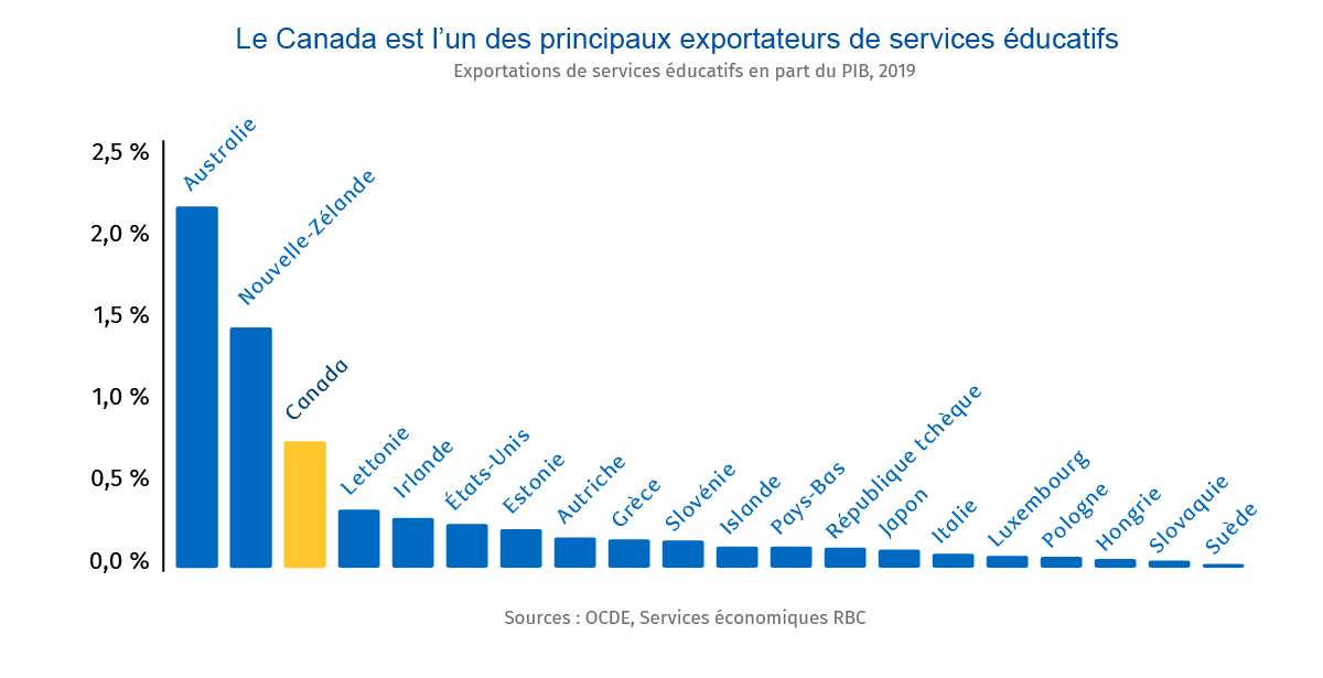 Reconnu pour ses programmes d’éducation internationale, le Canada a récemment dépassé le Royaume-Uni pour devenir la troisième destination des étudiants étrangers après les États-Unis et l’Australie. Sur la base des données par habitant, nous ne sommes devancés que par l’Australie dans le palmarès des pays fournisseurs de services éducatifs.