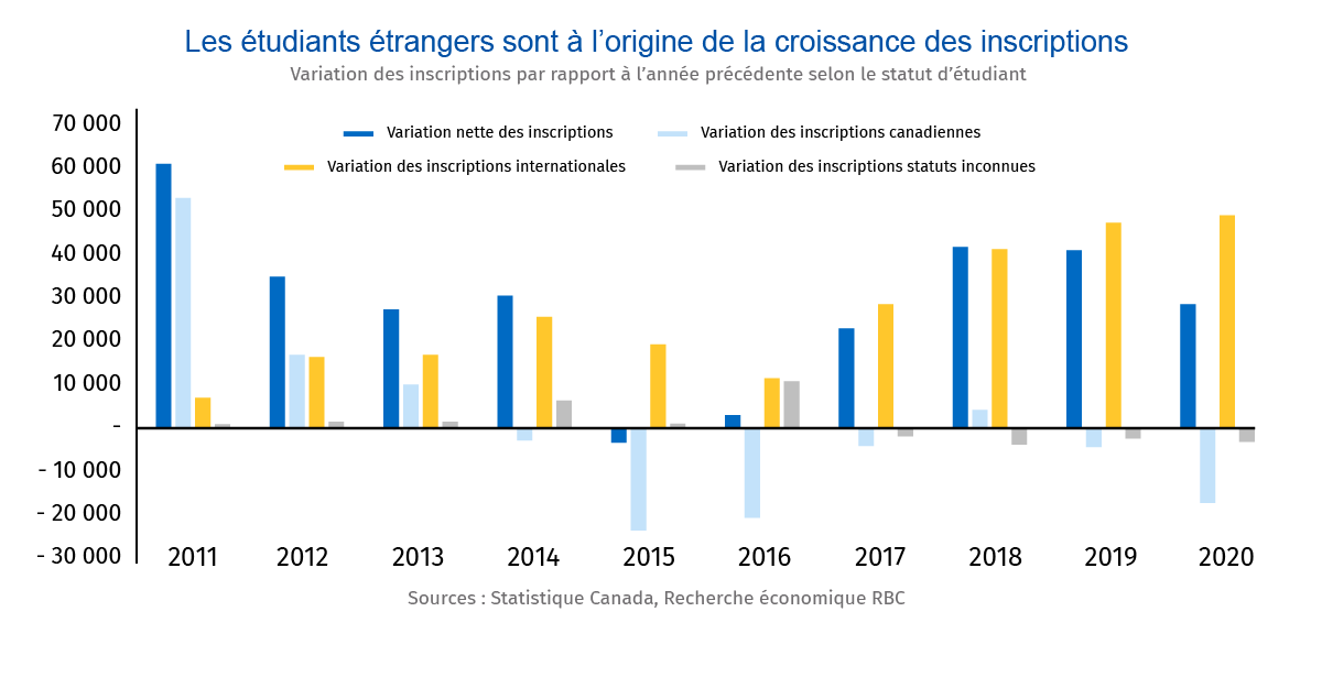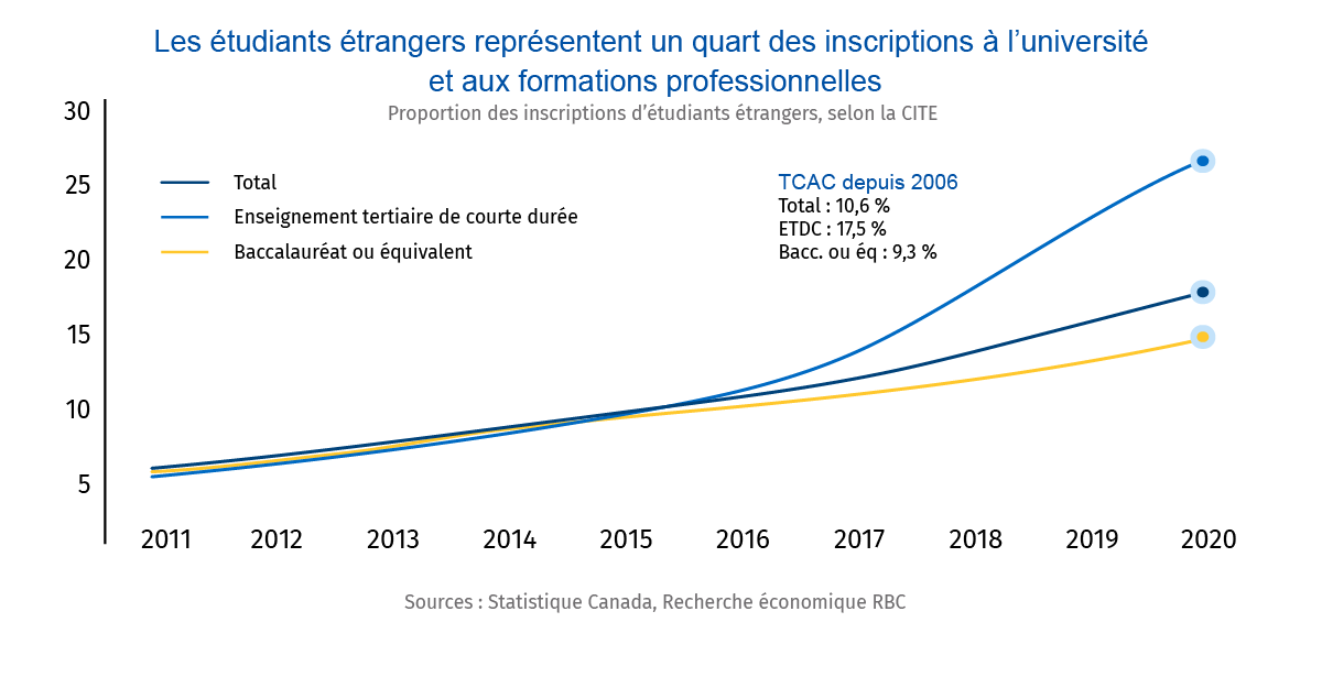 Les inscriptions d’étudiants étrangers dans les établissements d’enseignement postsecondaire canadiens sont passées de 7,2 % des effectifs en 2010 à près de 20 % en 2020. Depuis 2016, la croissance des inscriptions dans les établissements d’enseignement postsecondaire est entièrement attribuable aux étudiants étrangers.6