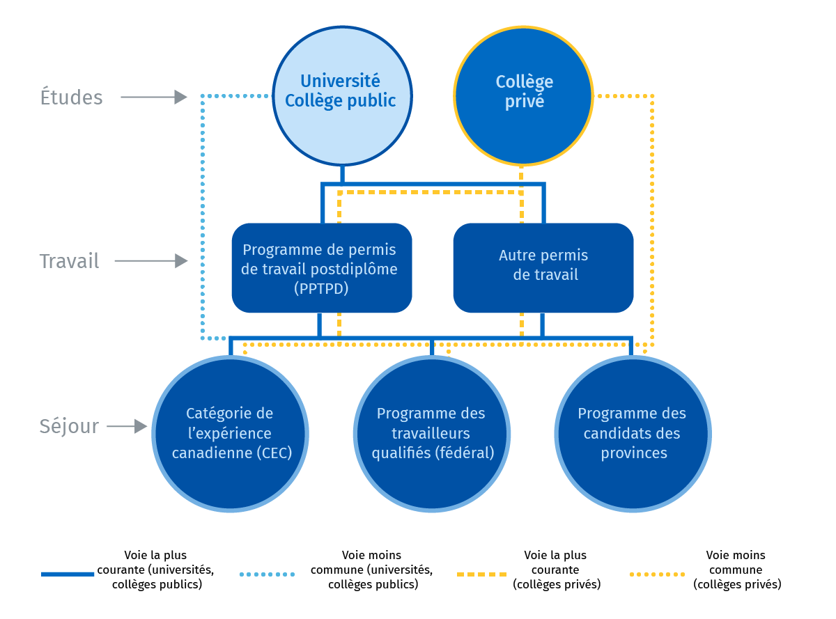 Le Canada a été le premier pays à créer un parcours plus clair vers la résidence permanente pour de nombreux étudiants étrangers. Plusieurs programmes, parmi lesquels le Programme de permis de travail postdiplôme (PPTPD), ont permis aux étudiants étrangers d’acquérir plus facilement une expérience professionnelle dans le pays et de commencer à travailler sans attendre la délivrance d’un permis de travail (un processus souvent long). Ce programme a été conçu pour retenir les étudiants étrangers au Canada et accélérer leur entrée sur le marché du travail, en les aidant à acquérir l’expérience qui pourrait appuyer leur demande de résidence permanente.