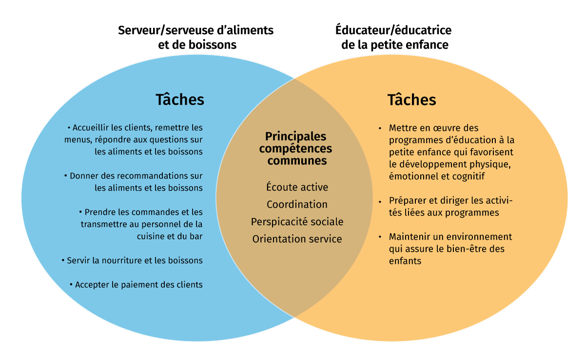 Environ 89 000 femmes travaillaient dans le secteur canadien des services de restauration et des débits de boissons au quatrième trimestre de 2020, en baisse de 33 % par rapport au premier trimestre. Même avant la COVID-19, on s’attendait à ce que les forces de l’automatisation aient une incidence sur ces postes. Cependant, les travailleurs du secteur possèdent de nombreuses compétences très utiles dans l’exercice d’autres fonctions, en particulier dans les domaines de l’éducation et des soins de santé. Les serveurs d’aliments et de boissons qui décideront de se réorienter posséderont plusieurs compétences recherchées chez les éducateurs de la petite enfance, qui feront probablement l’objet d’une forte demande. Ces deux emplois font appel à l’écoute active, à la coordination, à l’orientation service, à la perspicacité sociale et à l’expression orale. Bien entendu, qui dit réorientation professionnelle dit formation d’appoint ; en général, les éducateurs de la petite enfance doivent détenir au minimum un diplôme d’un programme d’études collégiales d’une durée de deux ou trois ans selon les provinces.