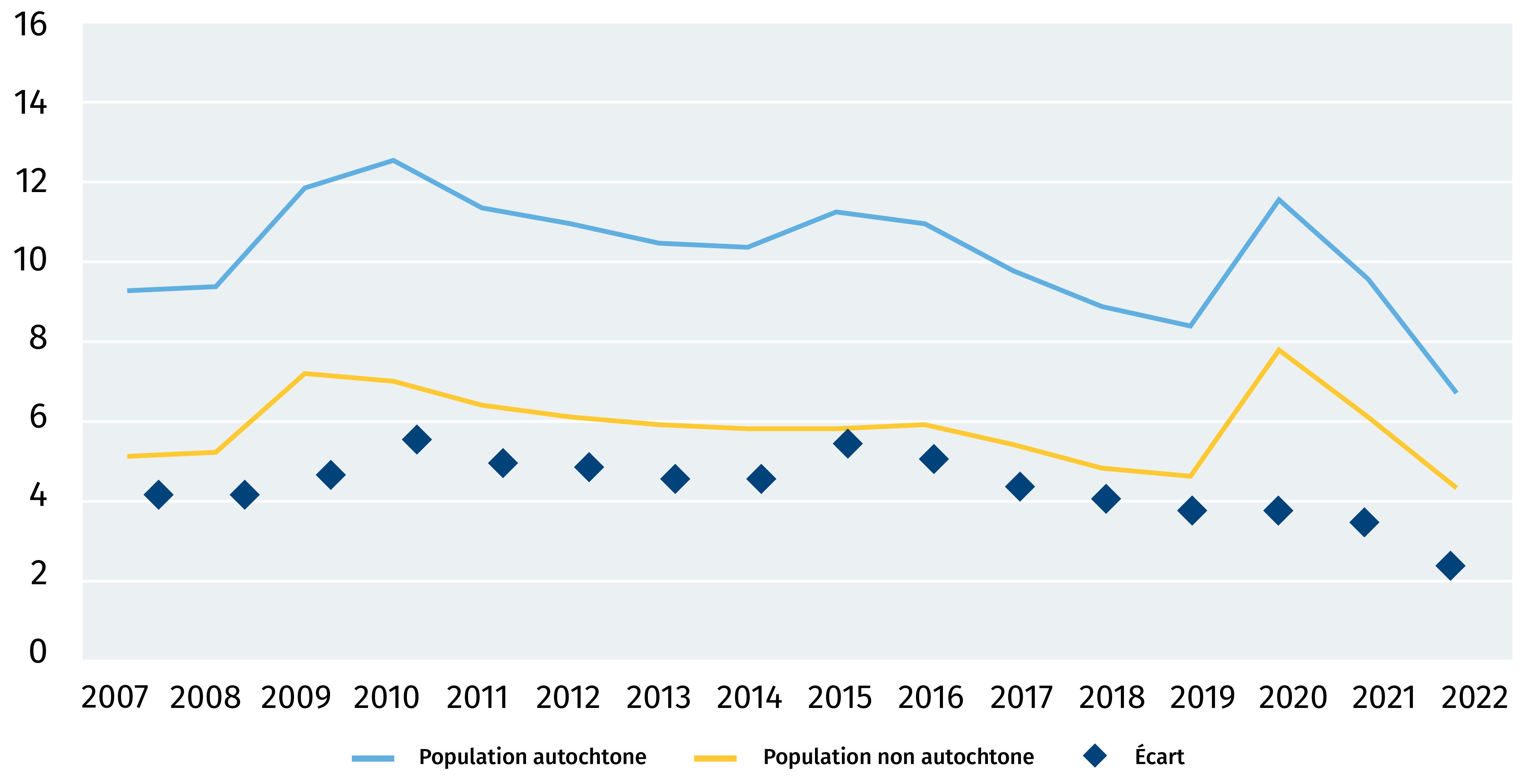 L’amélioration du niveau de scolarité dans la population autochtone du Canada devrait aussi améliorer les écarts de participation et de chômage. Bien que les peuples autochtones représentent 5 % de la population, l’économie autochtone occupe une part de 2,5 % dans la production canadienne d’avant la pandémie. Il subsiste un écart de près de six points de pourcentage entre le taux de participation des Autochtones et celui des non-Autochtones en âge de travailler (de 25 à 54 ans). En outre, les Autochtones ont traditionnellement un taux de chômage plus élevé et particulièrement tenace. Les Autochtones vivant dans des régions éloignées ont beaucoup plus de risques d’être au chômage. Plus de 17 % de la population autochtone en âge de travailler n’a pas participé à la population active en 2022, comparativement à 11 % de la population non autochtone. Le Canada vieillit rapidement, et bien que seulement un quart de la population ait moins de 24 ans, 40 % de la population autochtone appartient à ce groupe plus jeune. À présent que la population canadienne vieillit et que les pénuries de main-d’œuvre s’intensifient, la mise en place d’une infrastructure adéquate aiderait les jeunes Autochtones à tirer parti de ces tendances démographiques. Si les taux d’emploi et de participation des Autochtones convergeaient vers ceux des non-Autochtones, cela augmenterait la production autochtone de 17 % (avec une amélioration de l’emploi et des salaires) et ajouterait un demi-pourcentage à la production potentielle de l’économie canadienne chaque année.