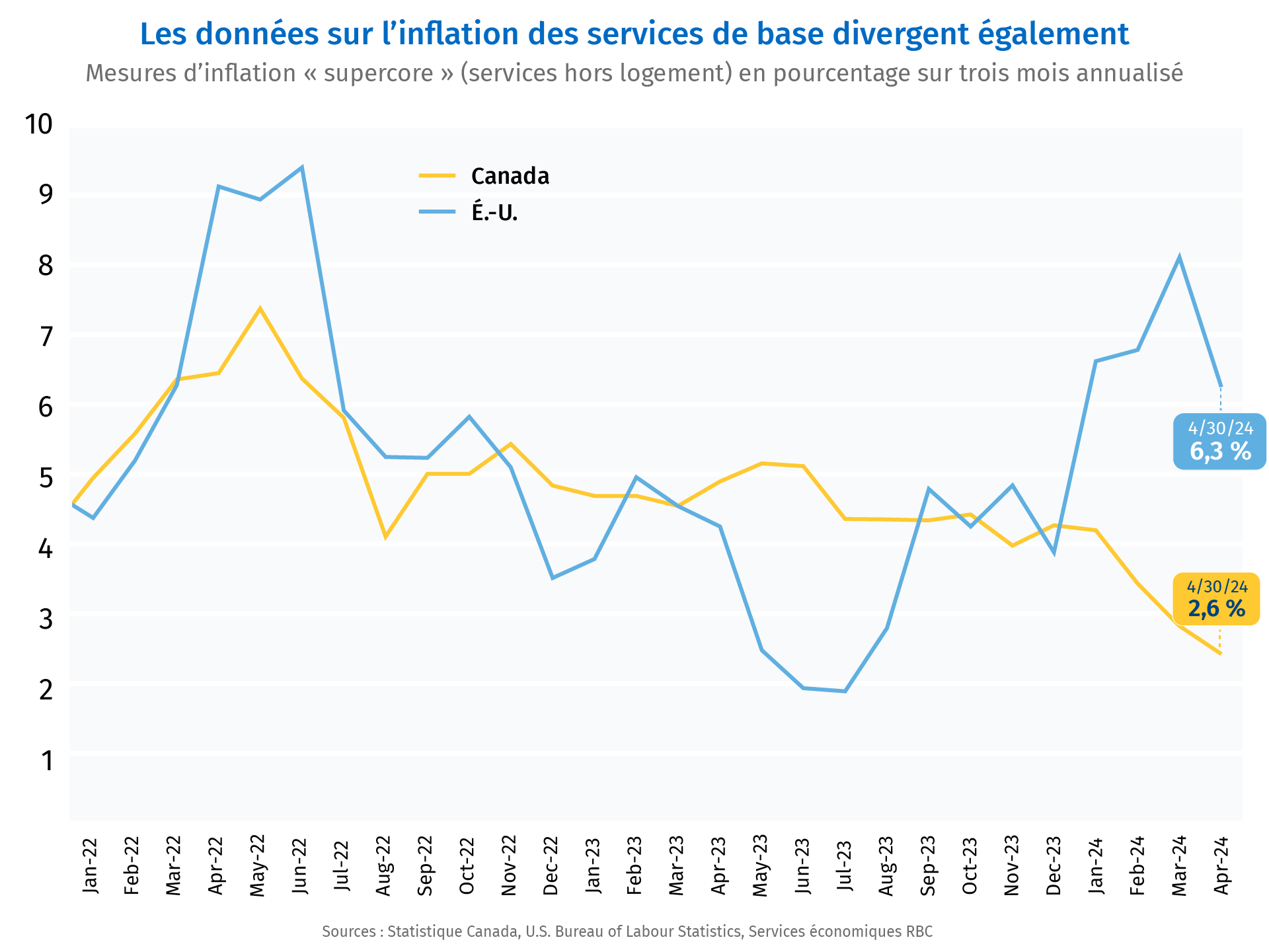 Le ralentissement de la demande de biens à l’échelle mondiale a déjà modéré la croissance des prix pour les biens échangeables au Canada et aux États-Unis. Toutefois, la hausse de la demande dans le secteur des services aux États-Unis se traduit par une hausse des tensions inflationnistes globales. La Banque du Canada et la Fed se sont concentrées sur les mesures de l’inflation « supercore » (services hors logement), qui donnent une meilleure idée des pressions sur les prix exercées par la consommation intérieure en services. Cette mesure a continué de fléchir au Canada au début de 2024, mais elle a commencé à s’accélérer aux États-Unis.