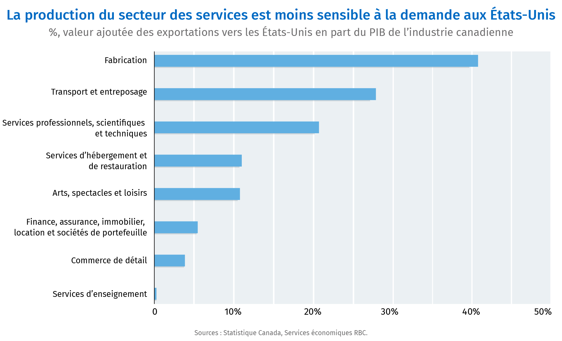 Cependant, malgré le ralentissement des activités manufacturières, la croissance économique est demeurée globalement stable aux États-Unis. Cette résilience est attribuable à la hausse des dépenses publiques et des dépenses de consommation dans le secteur des services, représentant en moyenne 70 % de la croissance du PIB au cours de la dernière année. Cependant, à la différence des biens, ces deux secteurs sont beaucoup moins susceptibles de donner lieu à des importations depuis le Canada. En 2019, à peine 10 % de la production des secteurs des services canadiens était affectée à la demande des États-Unis. La part est plus importante dans certains services comme les transports et l’entreposage, mais elle est pratiquement nulle en ce qui concerne les soins de santé et l’éducation.